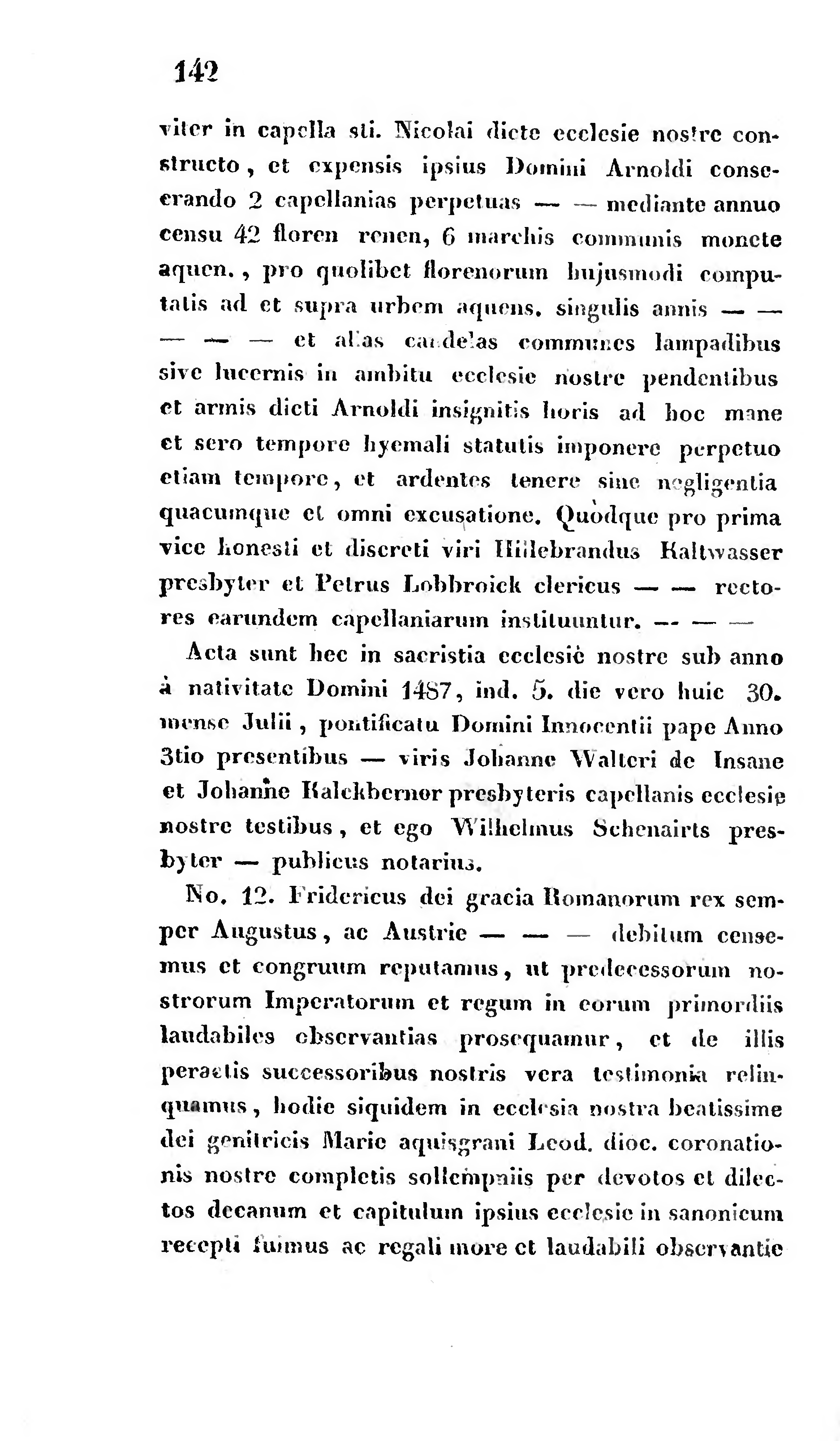 No. 12. Fridericus dei gracia Romanorum rex semper Augustus, ac Austrie - - - debitum censemus et congruum reputamus, ut predecessorum nostrorum Imperatorum et regum in eorum primordiis laudabiles observantias prosequamur, et de illis peractis successoribus nostris vera testimonia relinquamus, hodie siquidem in ecclesia nostra beatissime dei genitricis Marie aquisgrani Leod. dioc. coronationis nostre completis sollempaiis per devotos et dilectos decanum et capitulum ipsius ecclesie in sanonicum recepti fuimus ac regali more et laudabili observantie