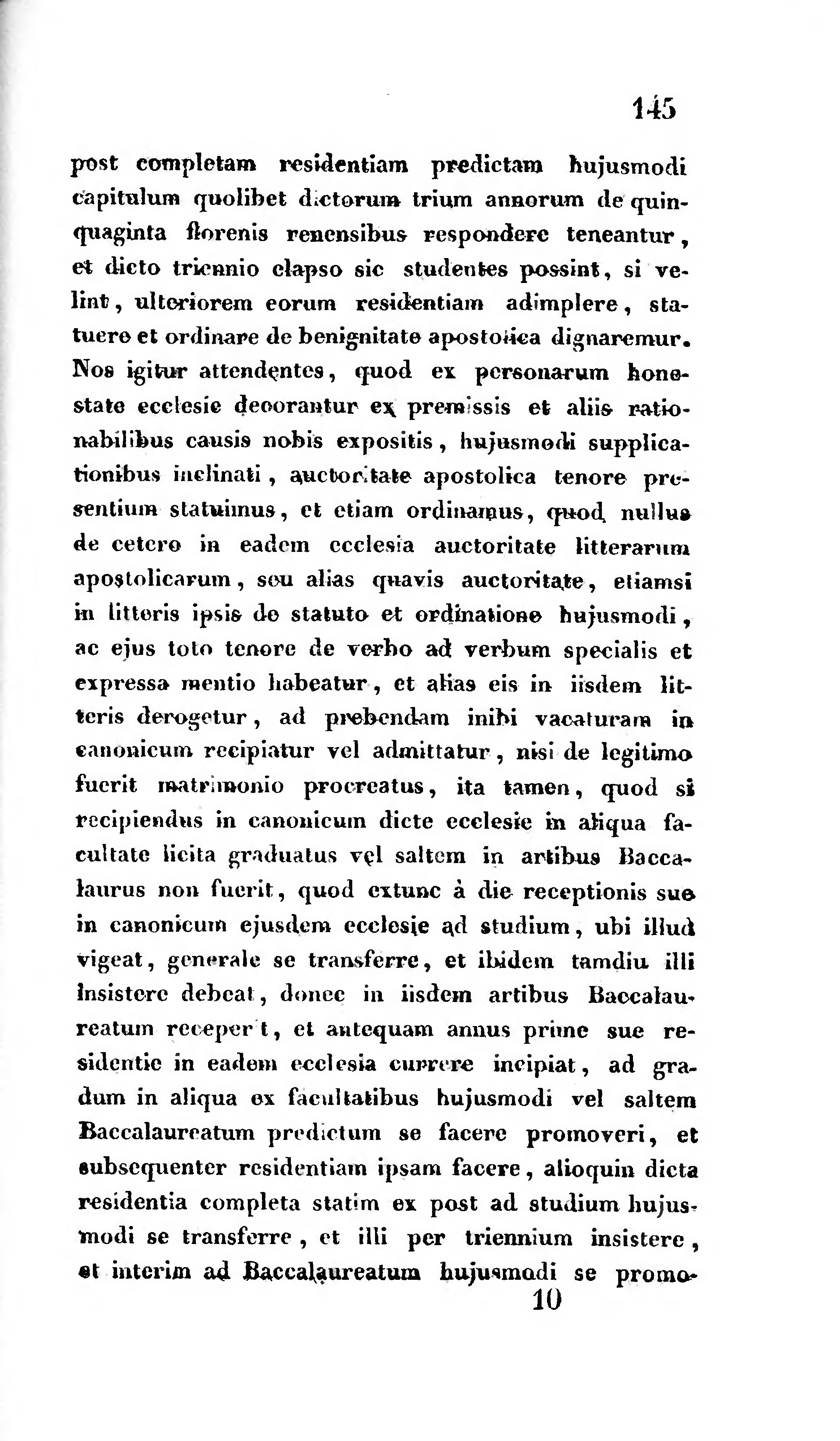 post completam residentiam predictam hujusmodi capitulum quolibet dictorum trium annorum de quinquaginta florenis renensibus respondere teneantur, et dicto triennio clapso sic studentes possint, si velint, ultoriorem eorum residentiam adimplere, statuere et ordinare de benignitate apostolica dignaremur. Nos igitur attendentes, quod ex personarum honestate ecclesie decorantur ex, premissis et aliis rationabilibus causis nobis expositis, hujusmodi suppltcationibus inclinati, auctoritate apostolica tenore presentium statuimus, et etiam ordinamus, quod nullus de cetero in eadem ecclesia auctoritate litterarum apostolicarum, seu alias quavis auctoritate, etiamsi in litteris ipsis de statuto et ordinatione hujusmodi, ac ejus toto tenore de verbo ad verbum specialis et expressa mentio habeatur, et alias eis in iisdem litteris derogetur, ad prebendam inibi vacaturara in canonicum recipiatur vel admittatur, nisi de legitimo fuerit matrimonio procreatus, ita tamen, quod si recipiendus in canonicum dicte ecclesie in aliqua facultate licita graduatus vel saltem in artibus Baccalaurus non fuerit, quod extunc a die receptionis sue in canonicum ejusdem ecclesie ad studium, ubi illud vigeat, generale se transferre, et ibidem tamdiu illi insistere debeat, donec in iisdem artibus Baccalaureatum receperit, et antequam annus prime sue residentie in eadem ecclesia currere incipiat, ad gradum in aliqua ox factiltatibus hujusmodi vel saltem Baccalaureatum predictum se facere promoveri, et subsequenter residentiam ipsam facere, alioquin dicta residentia completa statim ex post ad studium hujusmodi se transferre, et illi per triennium insistere, et interim ad Baccalaureatum hujusmodi se promoveri