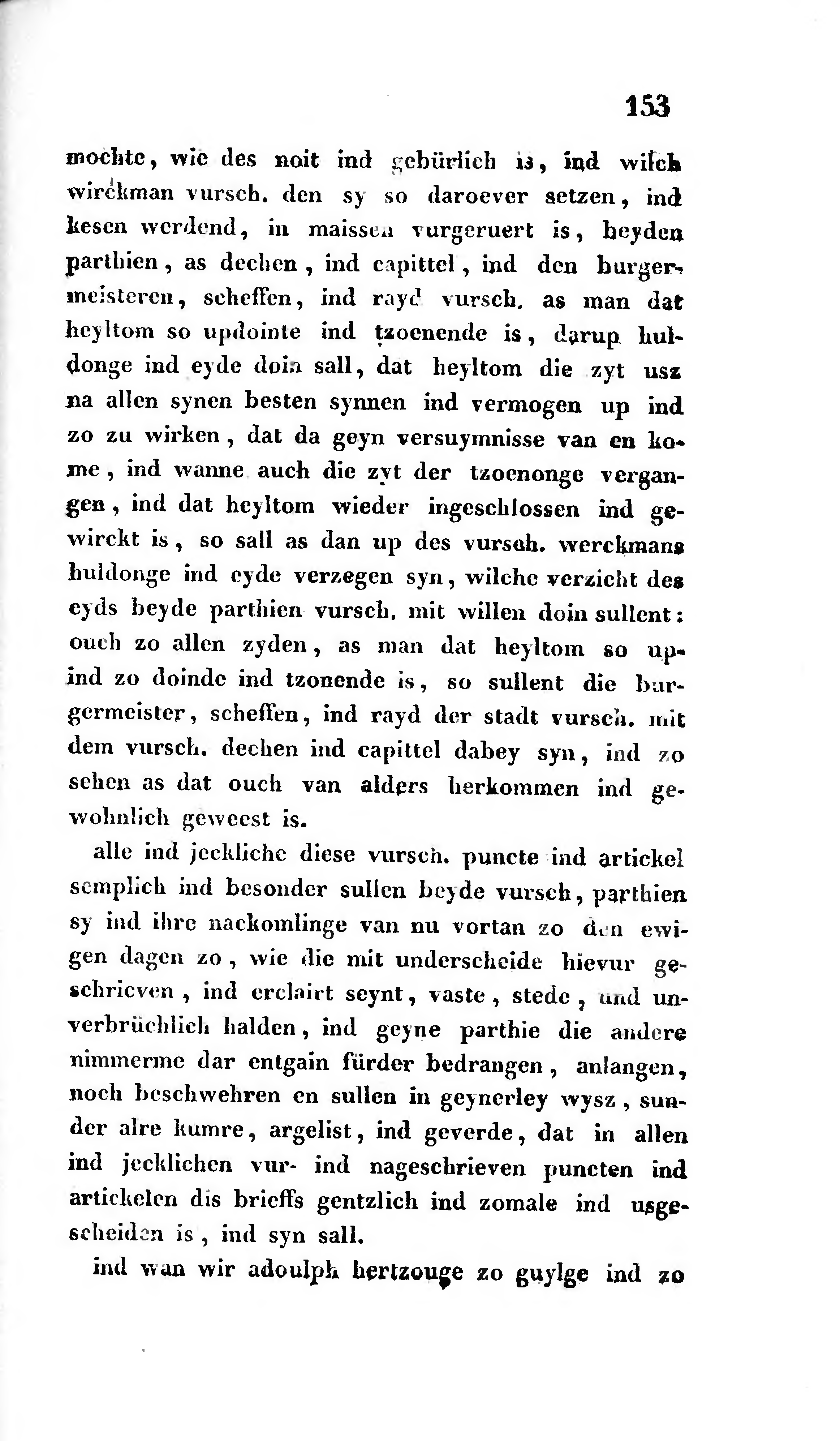 mochte, wie des noit ind gcbürlich is, ind wilch wirckman vursch. den sy so daroever setzen, ind kesen werdend, in maissen vurgeruert is, heyden parthien, as dechen, ind capittel, ind den hurgermeisteren, scheffen, ind rayd vursch. as man dat heyltom so updointe ind tzoenende is, darup huldonge ind eyde doin sall, dat heyltom die zyt usz na allen synen besten synnen ind vermogen up ind zo zu wirken, dat da geyn versuymnisse van en kome, ind wanne auch die zyt der tzoenonge vergangen, ind dat heyItom wieder ingeschlossen ind gewirckt is, so sall as dan up des vursch. werckmans huldonge ind eyde verzegen syn, wilche verzicht des eyds beyde parthien vursch. mit willen doin sullcnt: ouch zo allen zyden, as man dat heyltom so upind zo doinde ind tzonende is, so sullent die burgermeister, scheffen, ind rayd der Stadt vursch. mit dem vursch. dechen ind capittel dabey syn, ind zo sehen as dat ouch van alders herkommen ind gewohnlich geweest is.
