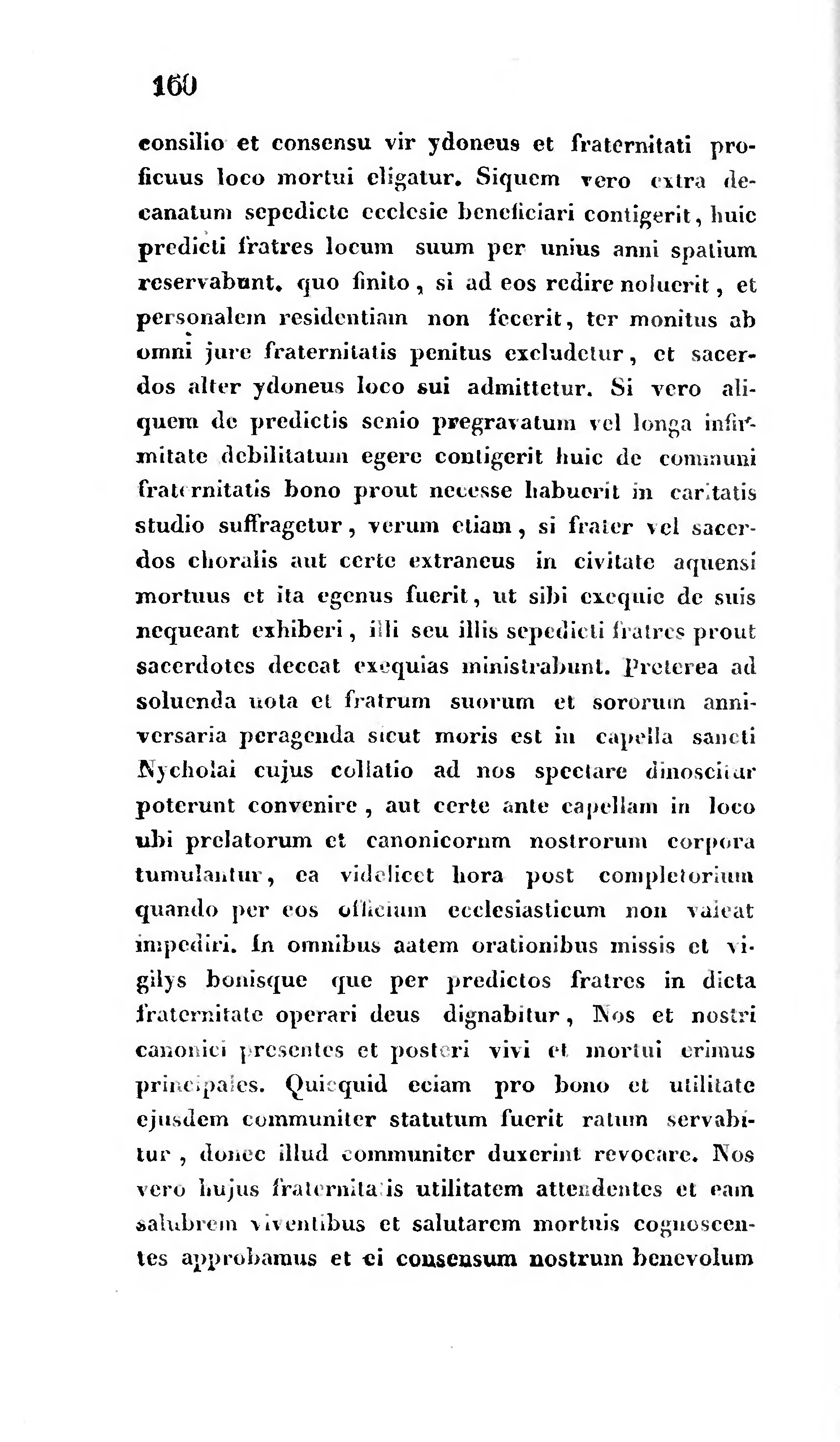consilio et consensu vir ydoneus et fraternitati proficuus loco mortui eligatur. Siquem vero extra decanatum sepedicte ecclesie beneficiari contigerit, huic predicti fratres locum suum per unius anni spatium reservabunt. quo finito, si ad eos redire noluerit, et personalem residentiam non fecerit, ter monitus ab omni jure fraternitatis penitus excludetur, et sacerdos alter ydoneus loco sui admittetur. Si vero aliquem de predictis senio pregravalum vel longa infirmitate debilitatum egere contigerit huic de communi fraternitatis bono prout necesse habuerit in caritatis studio suffragetur, verum etiam, si frater vel sacerdos choralis aut certe extraneus in civitate aquensi mortuus et ita egenus fuerit, ut sibi exequie de suis nequeant exhiberi, illi seu illis sepedicti fratres prout sacerdotes deceat exequias ministrabunt. Preterea ad soluenda uota et fratrum suorum et sororum anniversaria peragenda sicut moris est in capella sancti Nycholai cujus collatio ad nos spectare dinoscitur poterunt convenire, aut certe ante capellam in loco ubi prelatorum et canonicorum nostrorum corpora tumulantur, ea videlicet hora post completorium quando per eos officium ecclesiasticum non valeat impediri. In omnibus aatem orationibus missis et vigilys bonisque que per predictos fratres in dicta fraternitate operari deus dignabitur, Nos et nostri canonici presentes et posteri vivi et mortui erimus principales. Quicquid eciam pro bono et ulilitate ejusdem communiter statutum fuerit ratum servabitur, donec illud communiter duxerint revocare. Nos vero hujus fraternitatis utilitatem attendentes et eam salubrem viventibus et salutarem mortuis cognosecentes approbamus et ei consensum nostrum benevolum