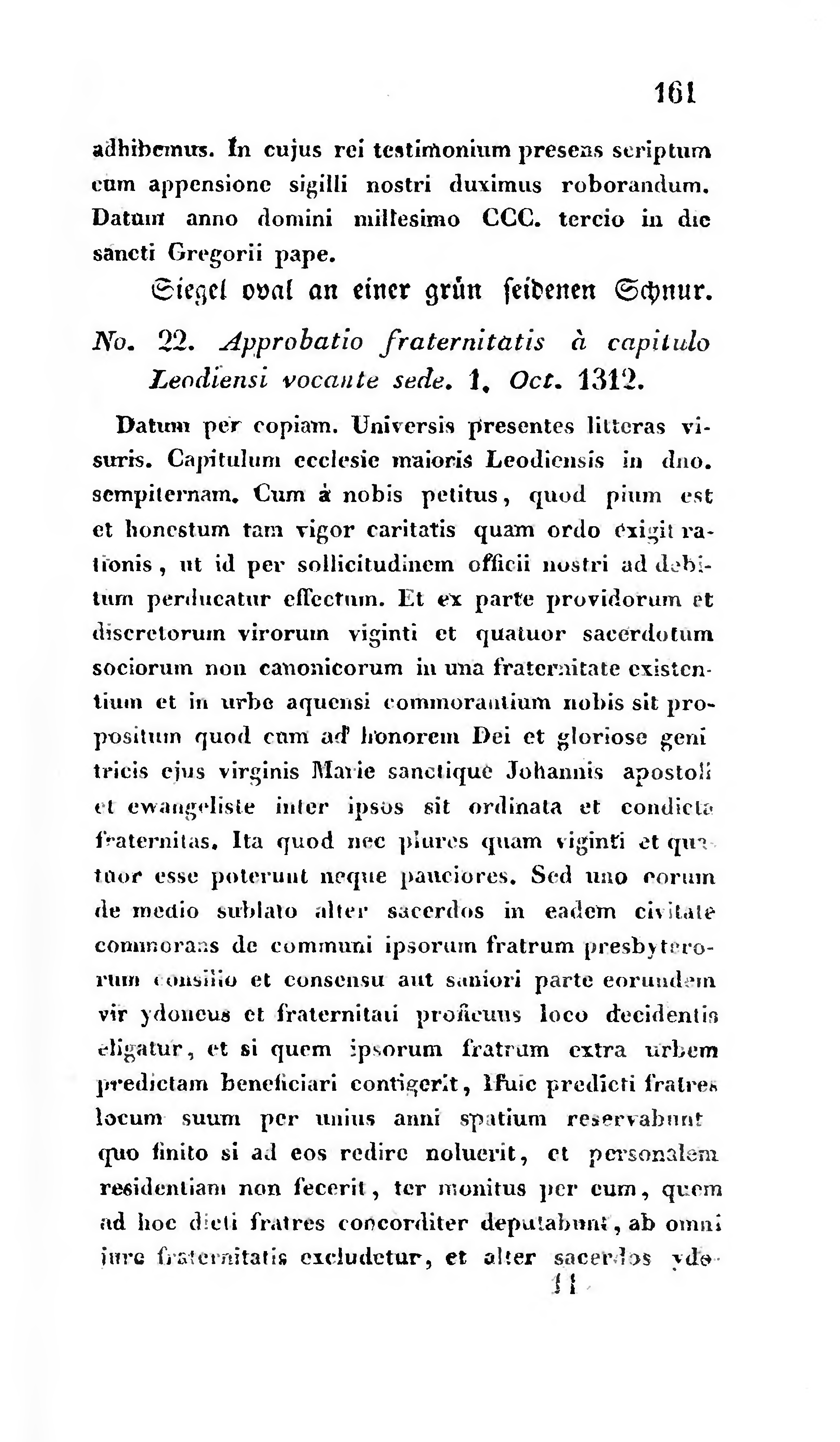 Datum per copiam. Universis presentes litteras visuris. Capitulum ecclesie maioris Leodiensis in dno, sempiternam. Cum á nobis petitus, quod pium est et honestum tam vigor caritatis quam ordo exigit rationis, ut id per sollicitudinem officii nostri ad debitum perducatur effectum. Et ex parte providorum et discretorum virorum viginti et quatuor sacerdotum sociorum non canonicorum in una fraternitate existentium et in urbe aquensi commorantium nobis sit propositum quod cum ad honorem Dei et gloriose genitricis ejus virginis Marie sanctique Johannis apostoli et ewangeliste inter ipsos sit ordinata et condicta fraternitas. Ita quod nec plures quam viginti et quatuor esse poterunt neque pauciores. Sed uno eorum de medio sublato alter sacerdos in eadem civitate conunorans de communi ipsorum fratrum presbyterorum consilio et consensu aut saniori parte eorundem vir ydoneus et fraternitati proficuus loco decidentis eligatur, et si quem ipsorum fratrum extra urbem predictam beneficiari contigerit, Ifuic predicti fratres locum suum per unius anni spatium reservabunt quo finito si ad eos redire noluerit, et personalem residentiam non fecerit, ter monitus per eum, quem ad hoc dicti fratres concorditer deputabunt, ab omni iure fraternitatis excludetur, et alter sacerdoss ydeneus