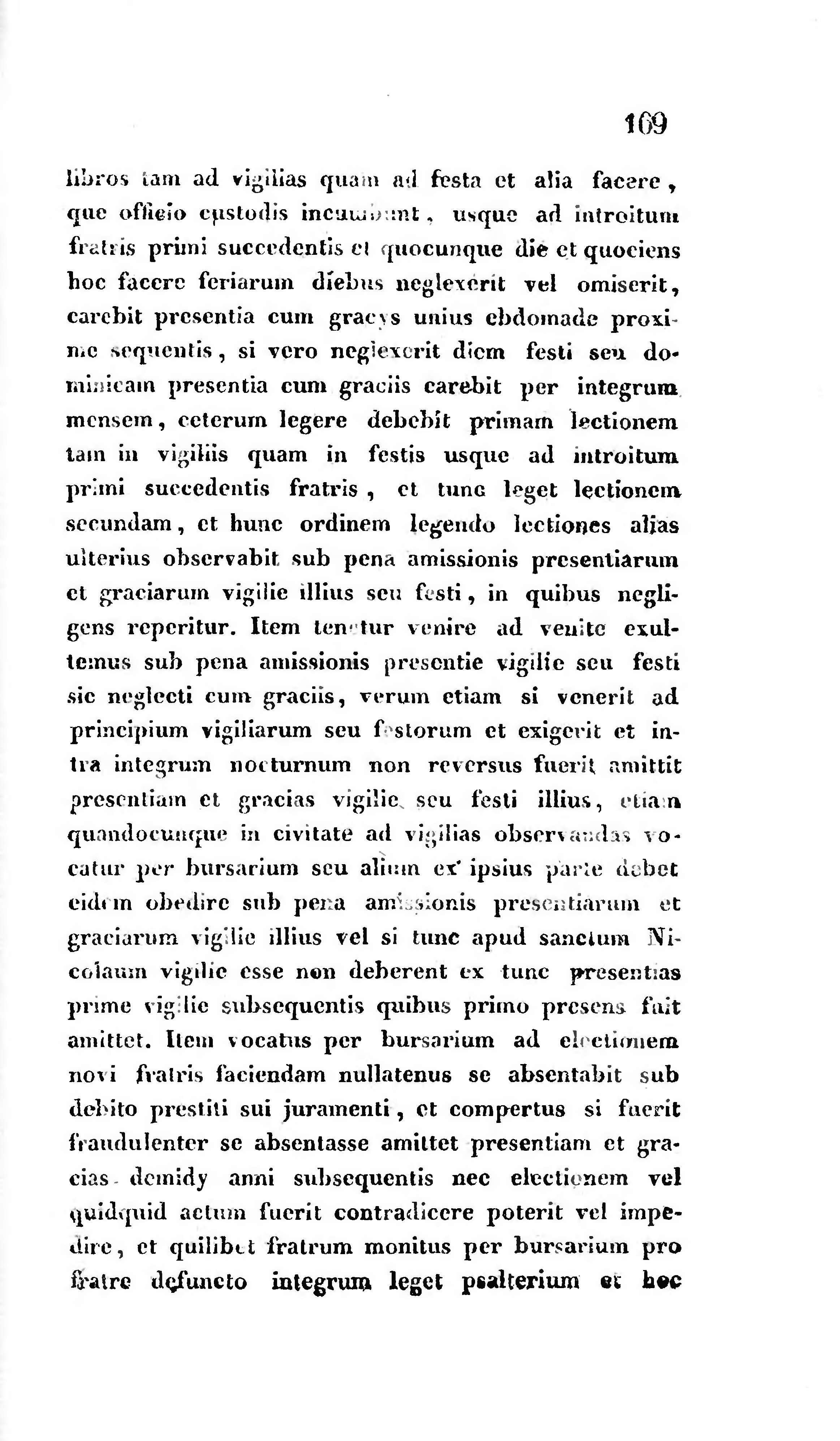 libros tam ad vigilias quam ad festa et alia facere, que officio custodis incunibunt, usque ad introitum fratris primi succedentis et quocunque die et quociens hoc facere feriarum diebus neglexerit vel omiserit, carebit presentia cum gracys unius ebdomade proxime sequentis, si vero neglexerit diem festi seu dominicam presentia cum graciis carebit per integrum mensem, ceterum legere debebit primam lectionem tam in vigiliis quam in festis usque ad introitum primi succedentis fratris, et tunc leget lectionem secundam, et hunc ordinem legendo lectiones alias ulterius observabit sub pena amissionis presentiarum et graciarum vigilie illius seu festi, in quibus negligens reperitur. Item tenetur venire ad venite exultemus sub pena amissionis presentie vigilie seu festi sic neglecti cum graciis, verum etiam si venerit ad principium vigiliarum seu festorum et exigerit et intra integrum nocturnum non reversus fuerit amittit presentiam et gracias vigilie seu festi illius, etiam quandocunque in civitate ad vigilias observandas vocatur per bursarium seu alium ex ipsius parte debet eidem obedire sub pena amissionis presentiarum et graciarum vigilie illius vel si tunc apud sanctum Nicolaum vigilie esse non deberent ex tunc presentias prime vigilie subsequentis quibus primo presens fuit amittet. Item vocatus per bursarium ad electionem novi fratris faciendam nullatenus se absentabit sub debito prestiti sui juramenti, et compertus si fuerit fraudulenter se absentasse amittet presentiam et gracias demidy anni subsequentis nec electionem vel quidquid actum fuerit contradicere poterit vel impedire, et quilibet fratrum monitus per bursarium pro fratre defuncto integrum leget psalterium et hoc