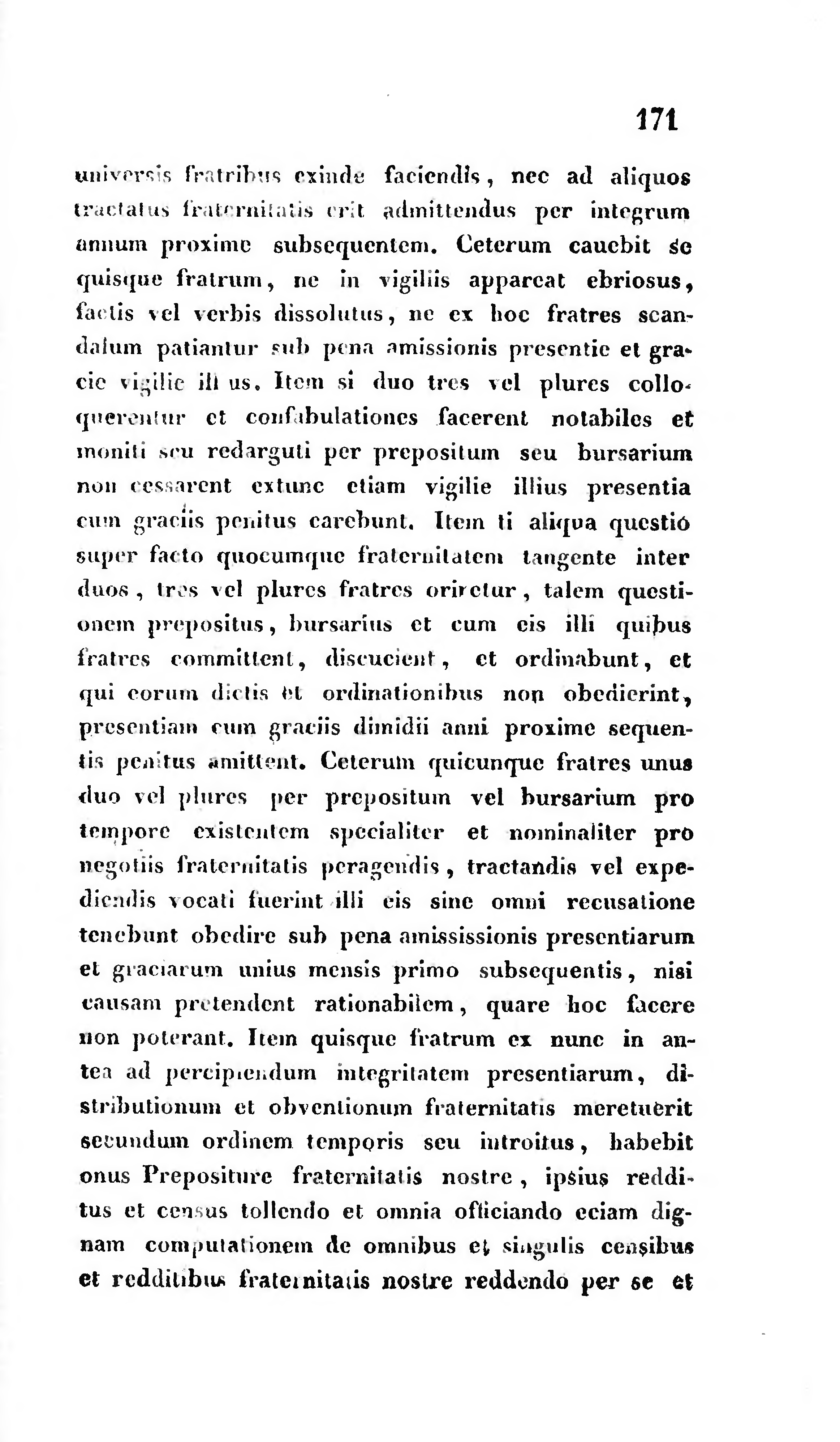 universis fratribus exinde faciendis, nec ad aliquos tractatus fraternitatis erit admittendus per integrum annum proxime subsequentem. Ceterum cauebit se quisque fratrum, ne in vigiliis appareat ebriosus, factis vel verbis dissolutus, ne ex hoc fratres scandalum patiantur sub pena amissionis presentie et gracie vigilie illius. Item si duo tres vel plures colloquerentur et confabulationes facerent notabiles et moniti seu redarguti per prepositum seu bursarium non cessarent extunc etiam vigilie illius presentia cum graciis penitus carebunt. Item ti aliqua questio super facto quocumque fraternitatem tangente inter duos, tres vel plures fratres oriretur, talem questionem prepositus, bursarius et cum eis illi quibus fratres committent, discucient, et ordinabunt, et qui corum dictis et ordinationibus non obedierint, presentiam cum graciis dimidii anni proxime sequentis penitus amittent. Ceterum quicunque fratres unus duo vel plures per prepositum vel bursarium pro tempore existentem specialiter et nominaliter pro negotiis fraternitatis peragendis, tractandis vel expediendis vocati fuerint illi eis sine omni recusatione tenebunt obedire sub pena amississionis presentiarum et graciarum unius mensis primo subsequentis, nisi causam pretendent rationabilem, quare hoc facere non poterant. Item quisque fratrum ex nunc in antea ad percipiendum integritatem presentiarum, distributionum et obventionum fraternitatis meretuerit secundum ordinem temporis seu iutroitus, habebit onus Prepositure fraternitatis nostre, ipsius redditus et census tollendo et omnia officiando eciam dignam computationem de omnibus et singulis censibus et reddilibus fraternitatis nostre reddendo per se et