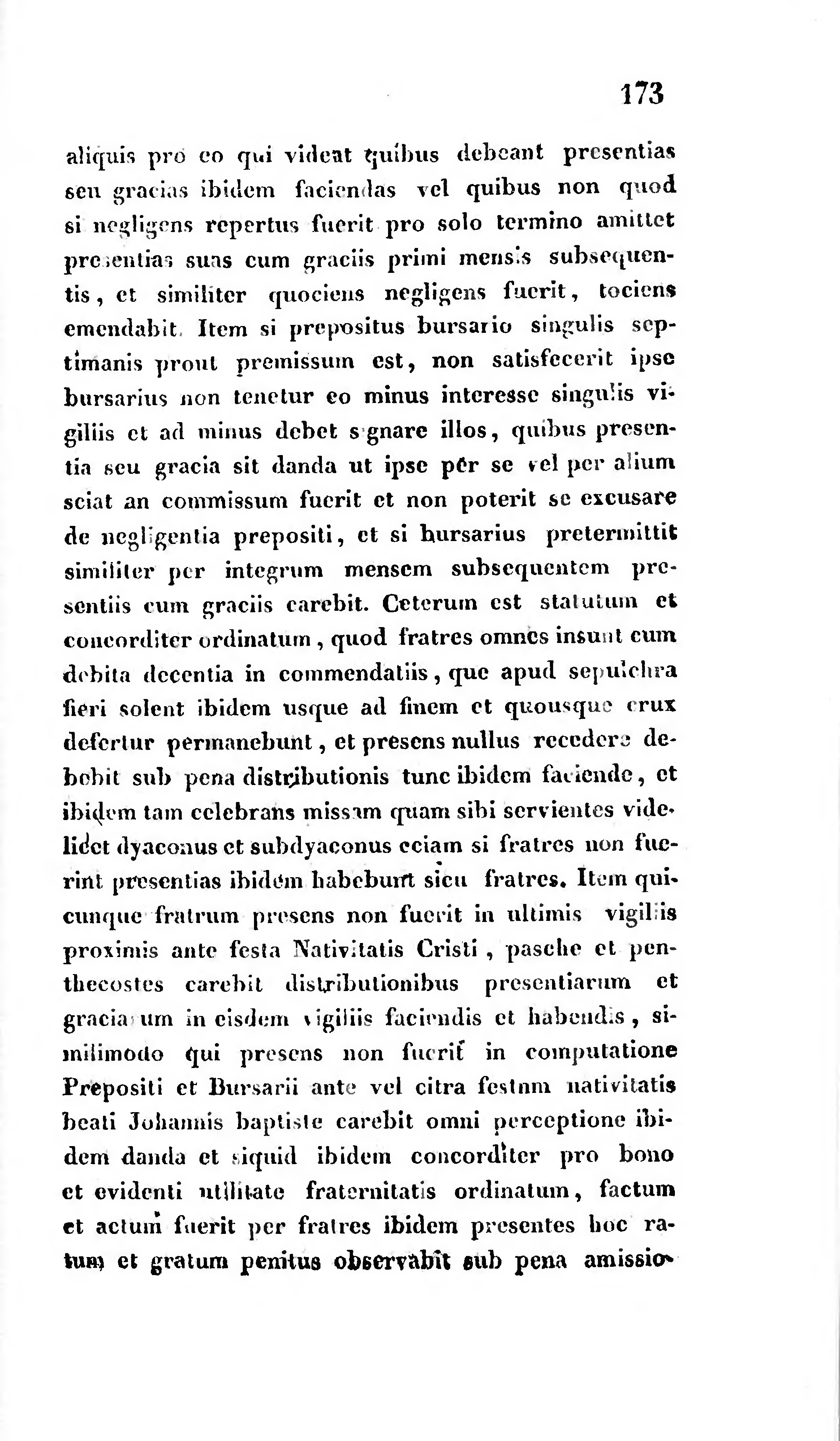 aliquis pro eo qui videat quibus debeant prcsentias seu gracias ibidem faciendas vel quibus non quod si negligens repertus fuerit pro solo termino amittet presentias suas cum graciis primi mensis subsequentis, et similiter quociens negligens fuerit, tociens emendabit. Item si prepositus bursario singulis septimanis prout premissum est, non satisfecerit ipse bursarius non tenetur eo minus interesse singulis vigiliis et ad minus debet signare illos, quibus presentia seu gracia sit danda ut ipse per se vel per alium sciat an commissum fuerit et non poterit se excusare de negligentia prepositi, et si bursarius pretermittit similiter per integrum mensem subsequentem presentiis cum graciis carebit. Ceterum est statutum et concorditer ordinatum, quod fratres omnes insunt cum debita decentia in commendatiis, que apud sepulchra fieri solent ibidem usque ad finem et quousque crux defertur permanebunt, et presens nullus recedere debebit sub pena distributionis tunc ibidem faciende, et ibidem tam celebrans missam quam sibi servientes videlicet dyaconus et subdyaconus eciam si fratres non fuerint presentias ibidem habebunt sicu fratres. Item quicunque fratrum presens non fuerit in ultimis vigiliis proximis ante festa Nativitatis Cristi, pasche et penthecostes carebit distributionibus presentiarum et graciarum in eisdem vigiliis faciendis et habendis, similimodo qui presens non fuerit in computatione Prepositi et Bursarii ante vel citra festum nativitatis beati Johannis baptiste carebit omni perceptione ibidem danda et siquid ibidem concorditer pro bono et evidenti utilitate fraternitatis ordinatum, factum et actum fuerit per fratres ibidem presentes hoc ratum et gratum penitus observabit aub pena amissionis