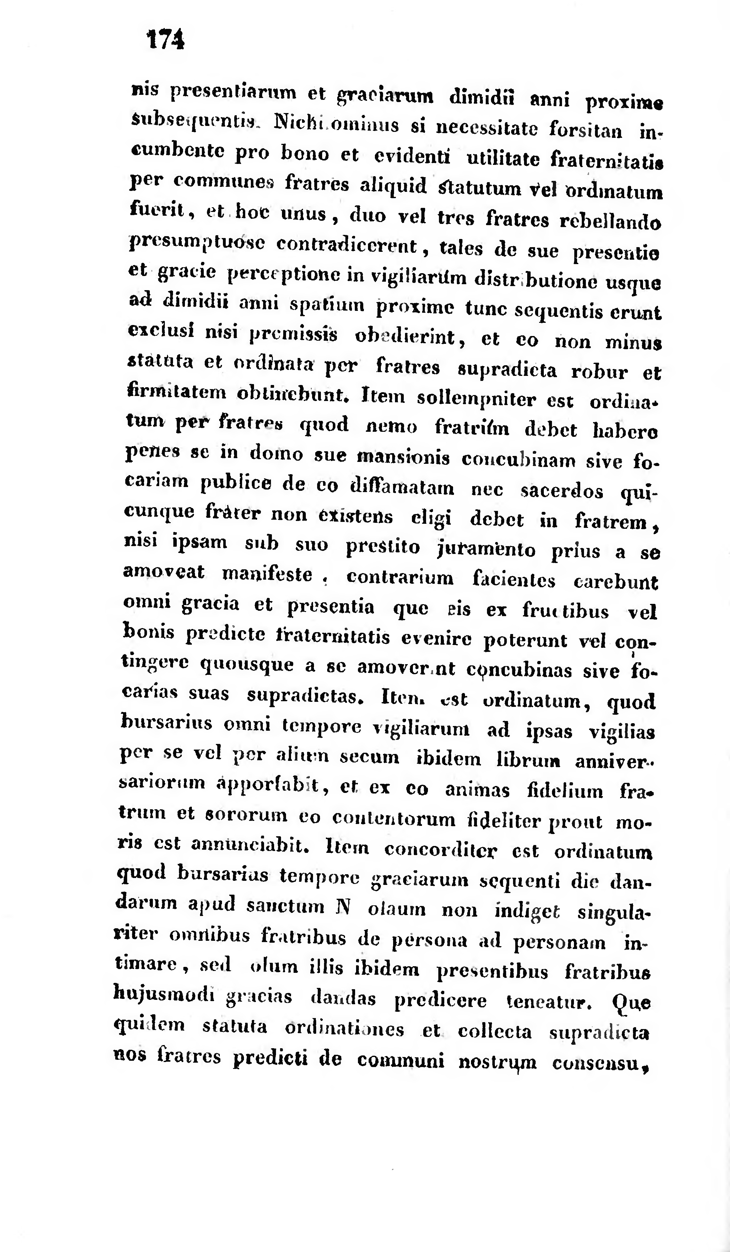 presentiarum et graciarum dimidii anni proxime subsequentis. Nichilominus si necessitate forsitan incumbente pro bono et evidenti utilitate fraternitatis per communes fratres aliquid statutum vel ordinatum fuerit, et hoc unus, duo vel tres fratres rebellando presumptuose contradicerent, tales de sue presentie et gracie perceptione in vigiliarum distributione usque ad dimidii anni spatium proxime tunc sequentis erunt exclusi nisi premissis obedierint, et eo non minus statuta et ordinata per fratres supradicta robur et firmitatem obtinebunt. Item sollempniter est ordinatum per fratres quod nemo fratrium debet habere penes se in domo sue mansionis coucubinam sive focariam publice de eo diffamatam nec sacerdos quicunque frater non existens eligi debet in fratrem. nisi ipsam sub suo prestito juramento prius a se amoveat manifeste, contrarium facientes carebunt omni gracia et presentia que eis ex fructibus vel bonis predicte fraternitatis evenire poterunt vel contingere quousque a se amoverint concubinas sive focarias suas supradictas. Iten. est ordinatum, quod bursarius omni tempore vigiliarum ad ipsas vigilias per se vel per alium secum ibidem librum anniversariorum apportabit, et ex eo animas fidelium fratrum et sororum eo contentorum fideliter prout moris est annunciabit. Item concorditer est ordinatum quod bursarius tempore graciarum sequenti die dandarum apud sanctum Nicholaum non indiget singulariter omnibus fratribus de persona ad personam intimare, sed olum illis ibidem presentibus fratribus hujusmodi gracias dandas predicere teneatur. Que quidem statuta ordinationes et collecta supradicta nos fratres predicti de communi nostrum consensu,