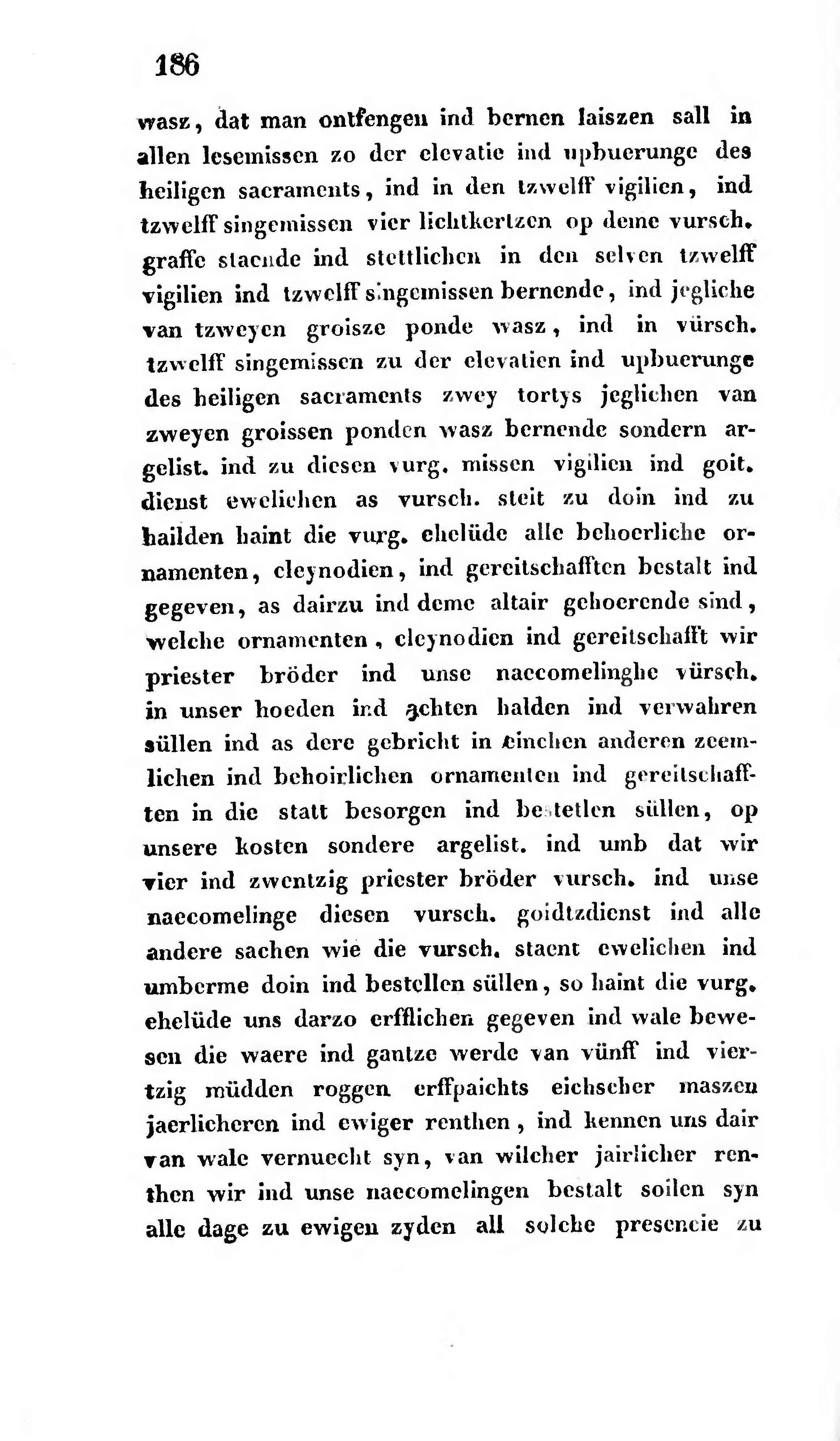 wasz, dat man ontfengen ind bernen laiszen sall in allen lesemissen zo der elevatie ind upbuerunge des heiligen sacraments, ind in den tzwelff vigilien, ind tzwelff singemissen vier licktkertzen op deme vursch. graffe staende ind stettlichen in den selven tzwelff vigilien ind tzwelff singemissen bernende, ind jegliche van tzweyen groisze ponde wasz, ind in vürsch. tzwelff singemissen zu der elevatien ind upbuerunge des heiligen sacraments zwey tortys jeglichen van zweyen groissen ponden wasz bernende sondern argelist. ind zu diesen vurg. missen vigilien ind goit. dienst ewelichen as vursch. steit zu doin ind zu hailden haint die vurg. ehelüde alle behoerliche ornamenten, cleynodien, ind gereitschäfften bestalt ind gegeven, as dairzu ind deme altair gehoerende sind, welche ornamenten , cleynodien ind gereitschafft wir priester bröder ind unse naecomelinghe vürsch. in unser hoeden ind achten halden ind verwahren süllen ind as dere gebricht in einchen anderen zeemlichen ind behoirlichen ornamenten ind gereitschafften in die statt besorgen ind besteilen süllen, op unsere kosten sondere argelist. ind umb dat wir vier ind zwentzig priester bröder vursch. ind unse naecomelinge diesen vursch. goidtzdienst ind alle andere sachen wie die vursch., staent ewelichen ind umberme doin ind bestellen süllen, so haint die vurg. ehelüde uns darzo erfflichen gegeven ind wale bewesen die waere ind gantze werde van vünff ind viertzig müdden roggen erffpaichts eichscher maszen jaerlicheren ind ewiger renthen, ind kennen uns dair van wale vernuecht syn, van wilcher jairlicher renthen wir ind unse naecomelingen bestalt soilen syn alle dage zu ewigen zyden all solche presencie zu