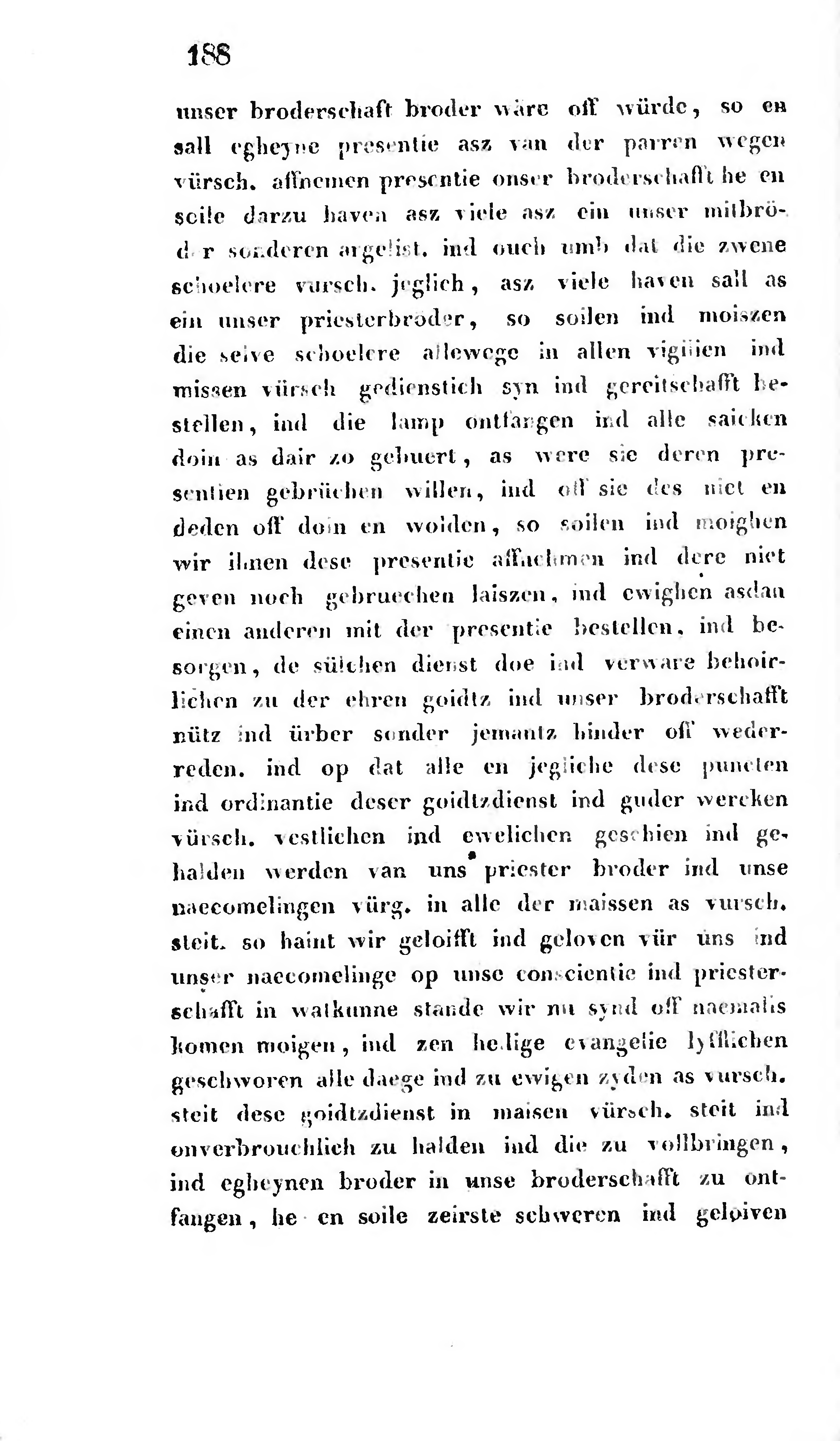 unser broderschaft broder wäre off würde, so en sall egheyne presentie asz van der parren wegen vürsch. affnemen presentie onser broderschafft he en soile darzu haven asz viele asz ein unser mitbröder sonderen arge!ist, ind ouch umb dat die zwene schoelere vursch. jeglicb, asz viele haven sall as ein unser priesterbroder, so soilen ind moiszen die seive scboelere allewege in allen vigilien ind missen vürsch. gedienstich syn ind gereitsehafft bestellen, ind die lamp ontfargen ind alle saicken doin as dair zo gebuert, as were sie deren presentien gebrüchen willen, ind off sie des niet en deden off doin en woiden, so soilen ind moighen wir ihnen dese presentie affachmemn ind dere niet geven noch gebruechen laiszen. ind ewighen asdan einen anderen mit der presentie bestellen. ind besorgen, de sülchen dienst doe ind verware behoirlichen zu der ehren goidtz ind unser broderschafft nütz ind ürber sonder jemantz hinder off wederreden. ind op dat alle en jegliche dese puncten ind ordinantie deser goidtzdienst ind guder wercken vürsch. vestlichcn ind ewelichen geschien ind gehalden werden van uns priester broder ind unse naecomelingen vürg. in alle der maissen as vursch. steit. so haint wir geloifft ind geloven vür uns ind unser naecomelinge op unse conscientie ind priesterschafft in watktunne stande wir nu synd off naemalis komen moigen, ind zen heilge evange!ie lyfflichen geschworen alle daege ind zu ewigen zyden as vürsch. steit dese goidtzdienst in maisen vürsch. steit ind onverbrouchlich zu halden ind die zu vollbringen, ind egheynen broder in unse broderschafft zu ontfangen, he en soile zeirste schweren ind geloiven