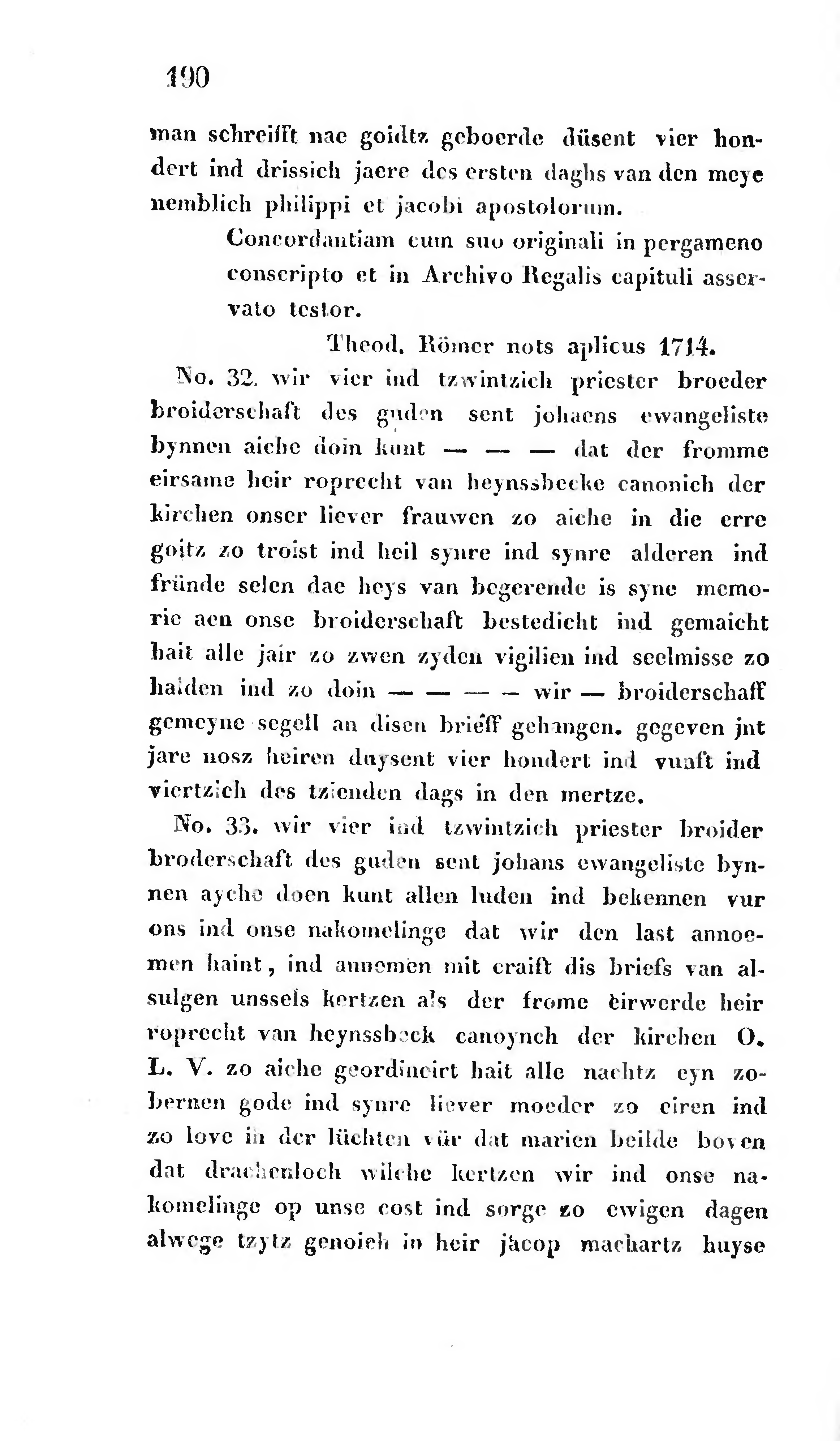 No. 33. wir vier ind tzwintzich priester broider broderschaft des guden sent jobans ewangeliste bynnen ayehe doen kunt allen luden ind bekennen vur ons ind onse nakomelinge dat wir den last annoemen haint, ind annemen mit craift dis briefs van alsulgen unssels kertzen a!s der frome eirwerde heir roprecht van heynssbeck canoynch der kirchen O. L. V. zo aiche geordineirt hait alle nachtz eyn zobernen gode ind synre liever moeder zo eiren ind z.o love in der lüchten vür dat marien beilde boven dat drachenloch wilche kertzen wir ind onse nakomelinge op unse cost ind sorge zo ewigen dagen alwege tzytz genoich in heir jacop machartz huyse