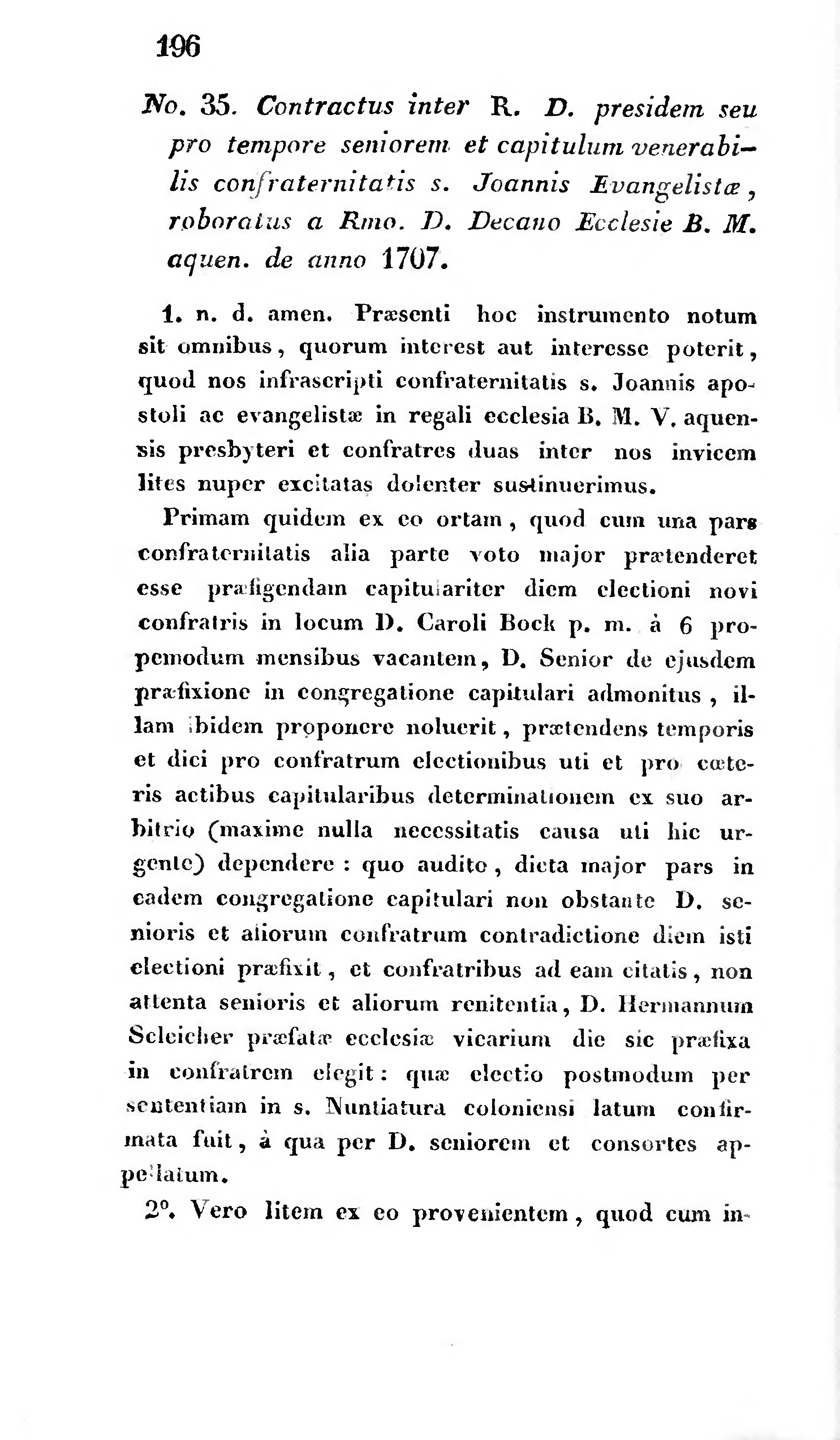 Primam quidem ex eo ortam , quod cum una pars confraternitatis alia parte voto major praetenderet esse praefigendam capitulariter diem electioni novi confratris in locum D. Caroli Bock p. m. à 6 propemodum mensibus vacantem, D. Senior de ejusdem praefixione in congregatione capitulari admonitus, illam ibidem proponere noluerit, praetendens temporis et dici pro confratrum electionibus uti et pro coeteris actibus capitularibus determinationem ex suo arbitrio (maxime nulla necessitatis causa uti hic urgente} dependere quo audito, dicta major pars in eadem congregatione capitulari non obstante D. senioris et aliorum confratrum contradictione diem isti electioni praefixit, et confratribus ad eam citatis, non attenta senioris et aliorum renitentia, D. Hermannum Scleicher praefatae ecclesiae vicarium die sic praefixa in confratrem elegit: quae electio postmodum per sententiam in s. Nuntiatura coloniensi latum confirmata fuit, à qua per D. seniorem et consortes ap-pellatum.