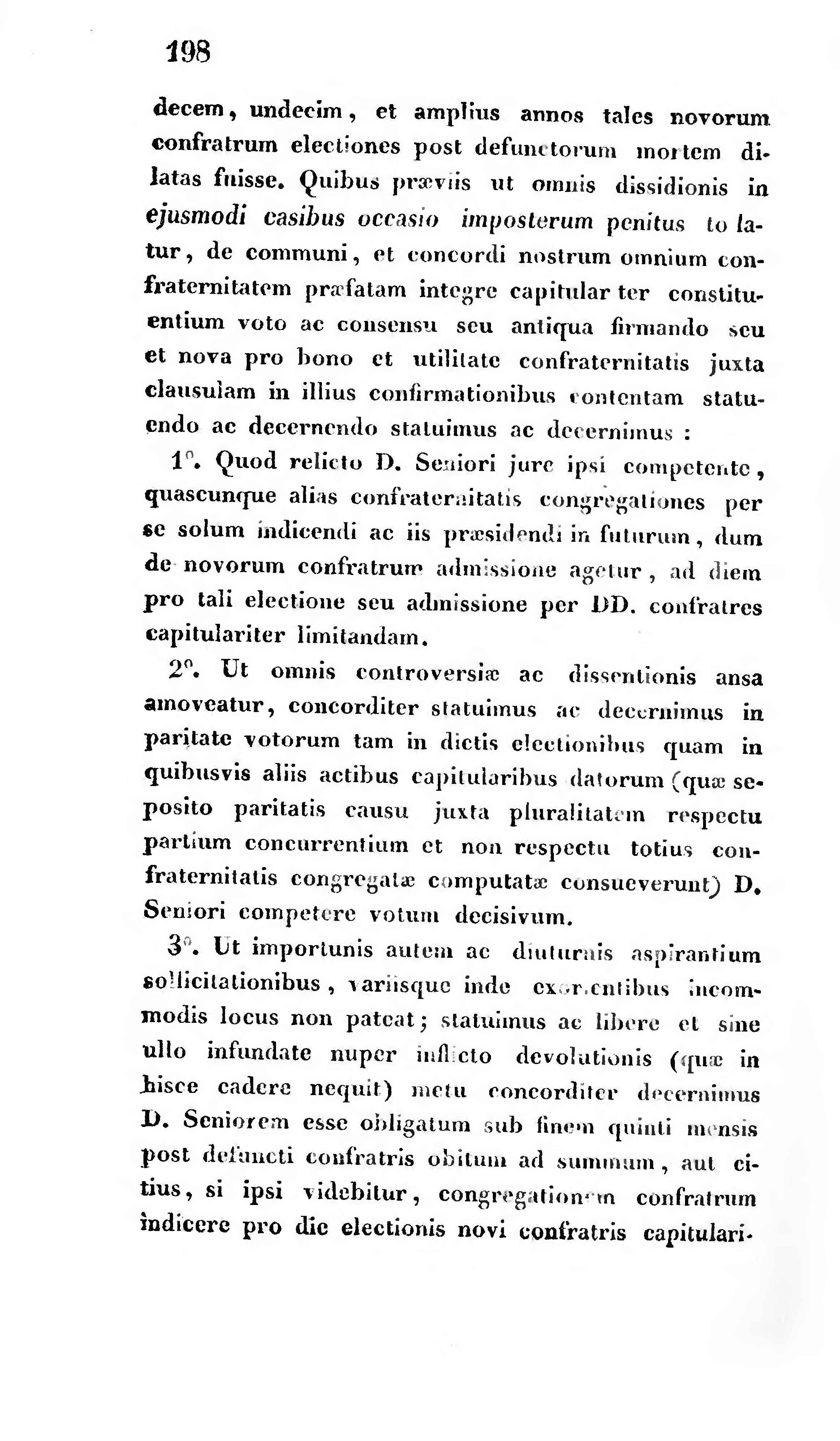 2°. Ut omnis controversiae ac dissentionis ansa amoveatur, concorditer statuimus ac decerminus in paritäte votorum tam in dictis electionihus quam in quibusvis aliis actibus capitularibus datorum (quae seposito paritatis causu juxta pluralitatem respectu partium concurrentium et non respectu totius confraternitatis congregatae computatae consueverunt) D. Seniori competere votum decisivum.