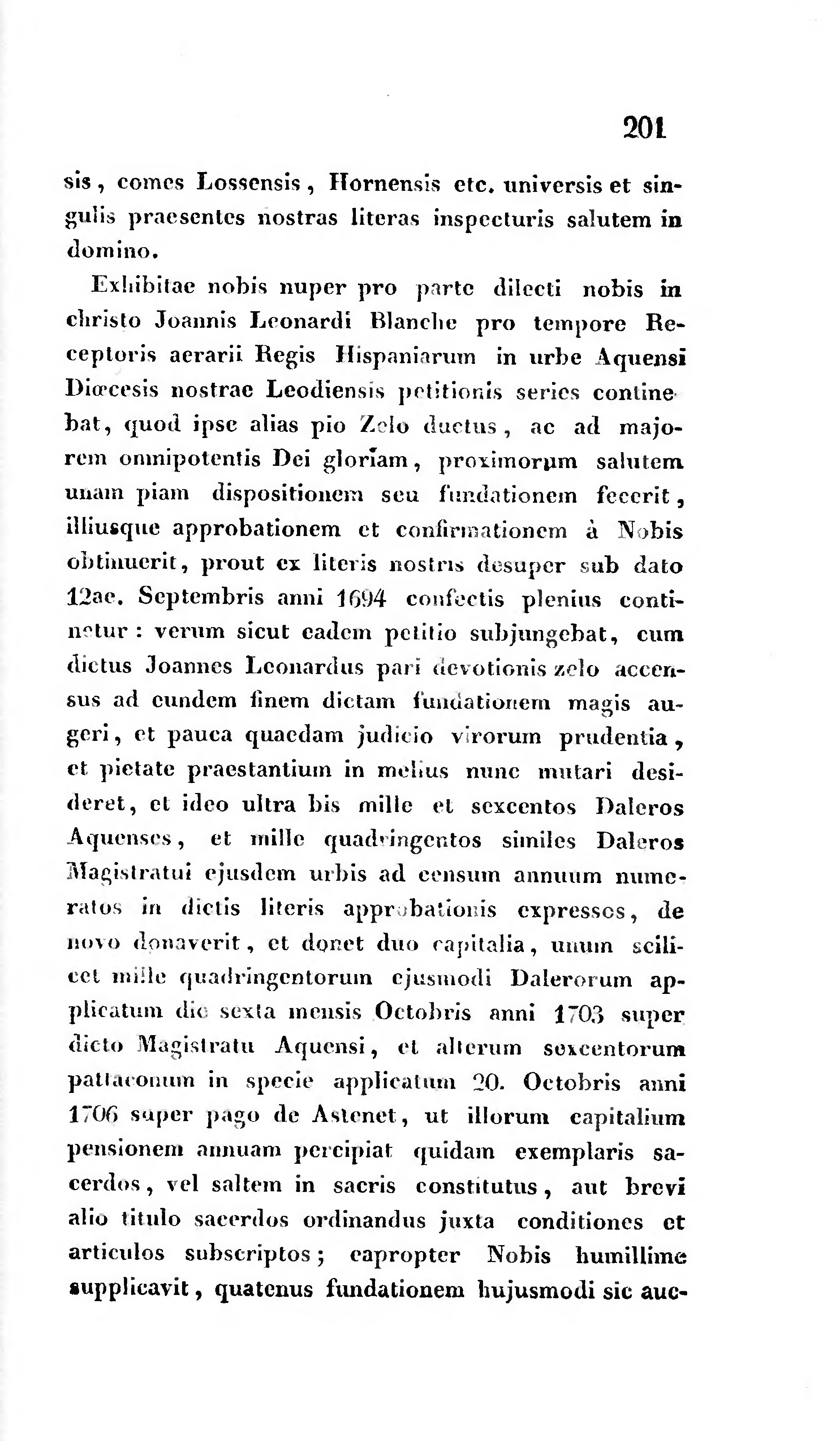 Exhibitae nobis nuper pro parte dilecti nobis in christo Joannis Leonardi Blanche pro tempore Receptoris aerarii Regis Hispaniarum in urbe Aquensi Dioecesis nostrae Leodiensis petitionis series continebat, quod ipse alias pio Zelo ductus, ac ad majorem omnipotentis Dei gloriam, proximorum salutem unam piam dispositionem seu fundationem fecerit, illiusque approbationem et confirmationem à Nobis obtinuerit, prout ex literis nostris desuper sub dato 12ae. Scptembris anni 1694 confectis plenius continetur: verum sicut eadem petitio subjungebat, cum dictus Joannes Lconardus pari devotionis zelo accensus ad eundem finem dictam fundationem magis augeri, et pauca quaedam judicio virorum prudentia, et pietate praestantium in melius nunc mutari desideret, et ideo ultra bis mille et sexcentos Daleros Aquenses, et mille quadringentos similes Daleros Magistratui ejusdem urbis ad censum annuum numeratos in dictis literis approbationis expressos, de novo donaverit, et donet duo rapitalia, unum scilicet mille quadringentorum ejusmodi Dalerorum applicatum die sexta mensis Octobris anni 1703 super dicto Magistratu Aquensi, et alterum sexcentorum pattaconum in specie applicatum 20. Octobris anni 1706 super pago de Astenet, ut illorum capitalium pensionem annuam percipiat quidam exemplaris sacerdos, vel saltem in sacris constitutus, aut brevi alio titulo sacerdos ordinandus juxta conditiones et articulos subscriptos; eapropter Nobis humillime supplicavit, quatenus fundationem hujusmodi sie auctam