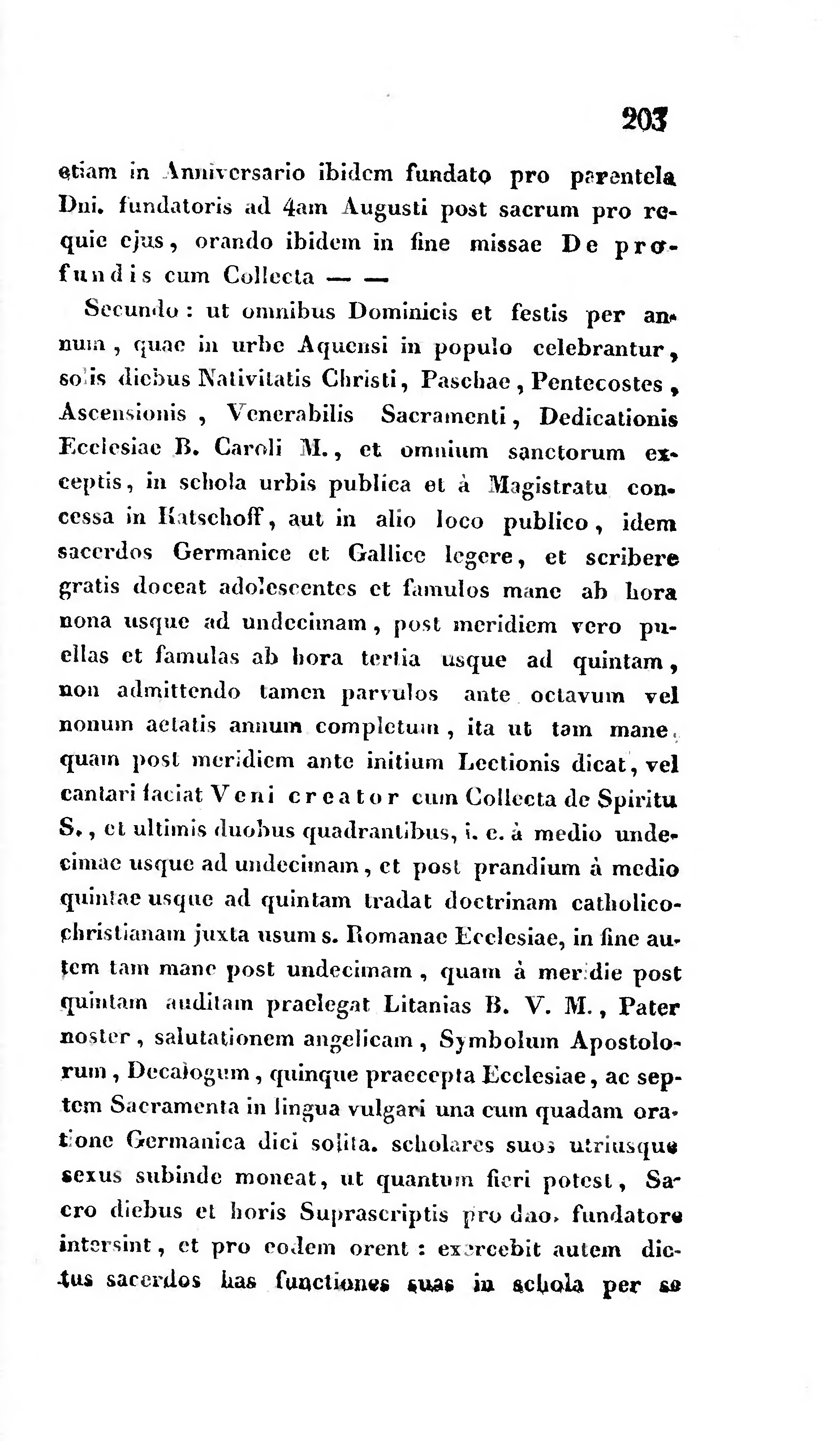 Secundu: ut omnibus Dominicis et festis per annum, quae in urbe Aquensi in populo celebrantur, solis diebus Nativitatis Christi, Paschae, Pentecostes, Ascensionis, Venerabilis Sacramenti, Dedicationis Ecclesiae B. Caroli M., et omnium sanctorum exceptis, in schola urbis publica et à Magistratu concessa in Katschoff, aut in alio loco publico, idem sacerdos Germanice et Gallice legere, et scribere gratis doceat adolescentes et famulos mane ab hora nona usque ad undecimam, post meridiem vero puellas et famulas ab hora tertia usque ad quintam, non admittendo tamen parvolos ante octavum vel nonum aetatis annum completum, ita ut tam mane, quam post meridiem ante initium Lectionis dicat, vel cantari faciat Veni creator cum Collecta de Spiritu S., et ultimis duobus quadrantibus, i. e. à medio undecimae usque ad undecimam, et post prandium à medio quintae usque ad quintam tradat doctrinam calholico-christianam juxta usum s. Romanae Ecclesiae, in fine autem tam mane post undecimam, quam à meridie post quintam auditam praelegat Litanias B. V. M., Pater noster, salutationem angelicam, Symbolum Apostolorum, Decalogum, quinque praecepta Ecclesiae, ac septem Sacramenta in lingua vulgari una cum quadam oratione Germanica dici solita. scholares suos utriusque sexus subinde moneat, ut quantum fieri polest, Sacro diebus et horis Suprascriptis pro dao. fundatore intersint, et pro eodem orent: exercebit autem dictus sacerdos has functiones suas in schola per se