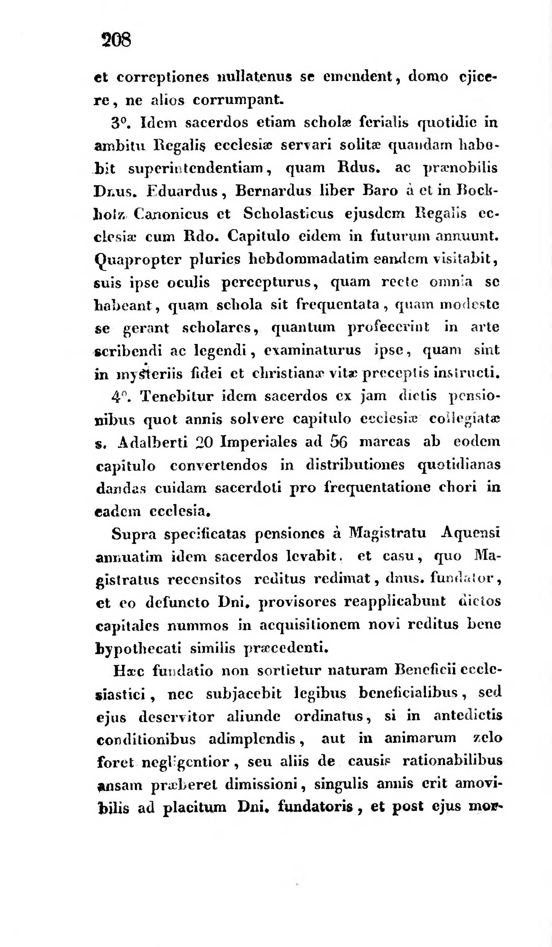 3°. Idem sacerdos etiam scholae ferialis quotidie in ambitu Regalis ecclesiae servari solitae quandam habebit superintendentiam, quam Rdus. ac praenobilis Dnus. Eduardus, Bernardus liber Baro à et in Bockholz Canonicus et Scholasticus ejusdem Regalis ecclesiae cum Rdo. Capitulo eidem in futurum annuunt. Quapropter pluries hebdommadatim eandem visitabit, suis ipse oculis percepturus, quam recte omnia se habeant, quam schola sit frequentata, quam modeste se gerant scholares, quantum profecerint in arte scribendi ac legendi, examinaturus ipse, quam sint in mysteriis fidei et christianae vitae preceptis instructi.
