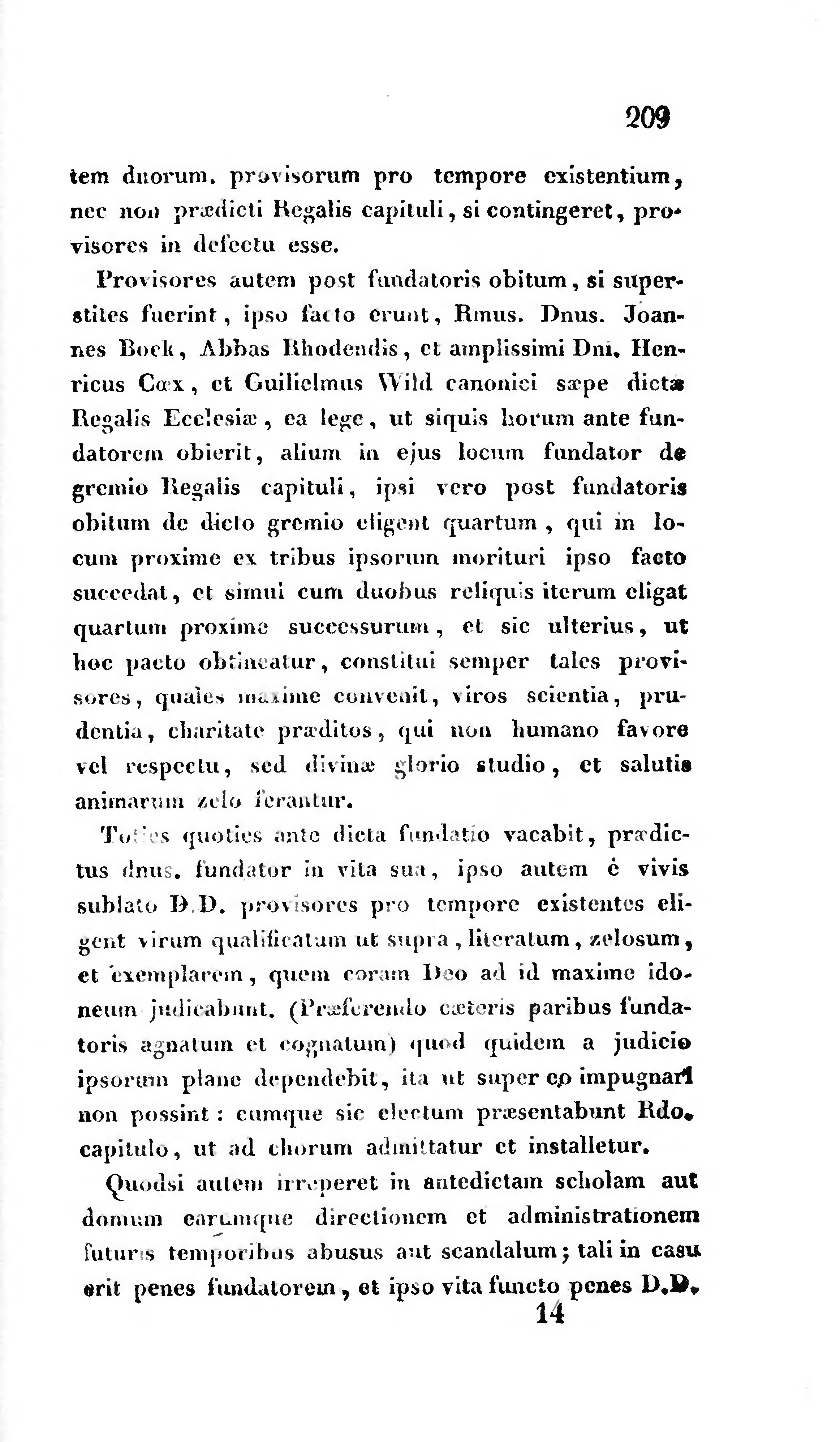Provisores autem post fundatoris obitum, si superstites fuerint, ipso facto erunt, Rmus. Dnus. Joannes Bock, Abbas Rhodendis, et amplissimi Dni, Henricus Coex, et Guilielmus Wild canonici saepe dictae Regalis Ecclesiae, ea lege, ut siquis horum ante fundatorem obierit, alium in ejus locum fundator de gremio Regalis capituli, ipsi vero post fundatoris obitum de dicto gremio eligent quartum, qui in locum proxime ex tribus ipsorum morituri ipso facto succedat, et simul cum duobus reliquis iterum eligat quartum proxime successurum, et sic ulterius, ut hoc pacto obtineatur, constitui semper tales provisores, quales maxime convenit, viros scientia, prudentia, charitate praeditos, qui non humano favore vel respectu, sed divinae glorio studio, et salutis animarum zelo ferantur.