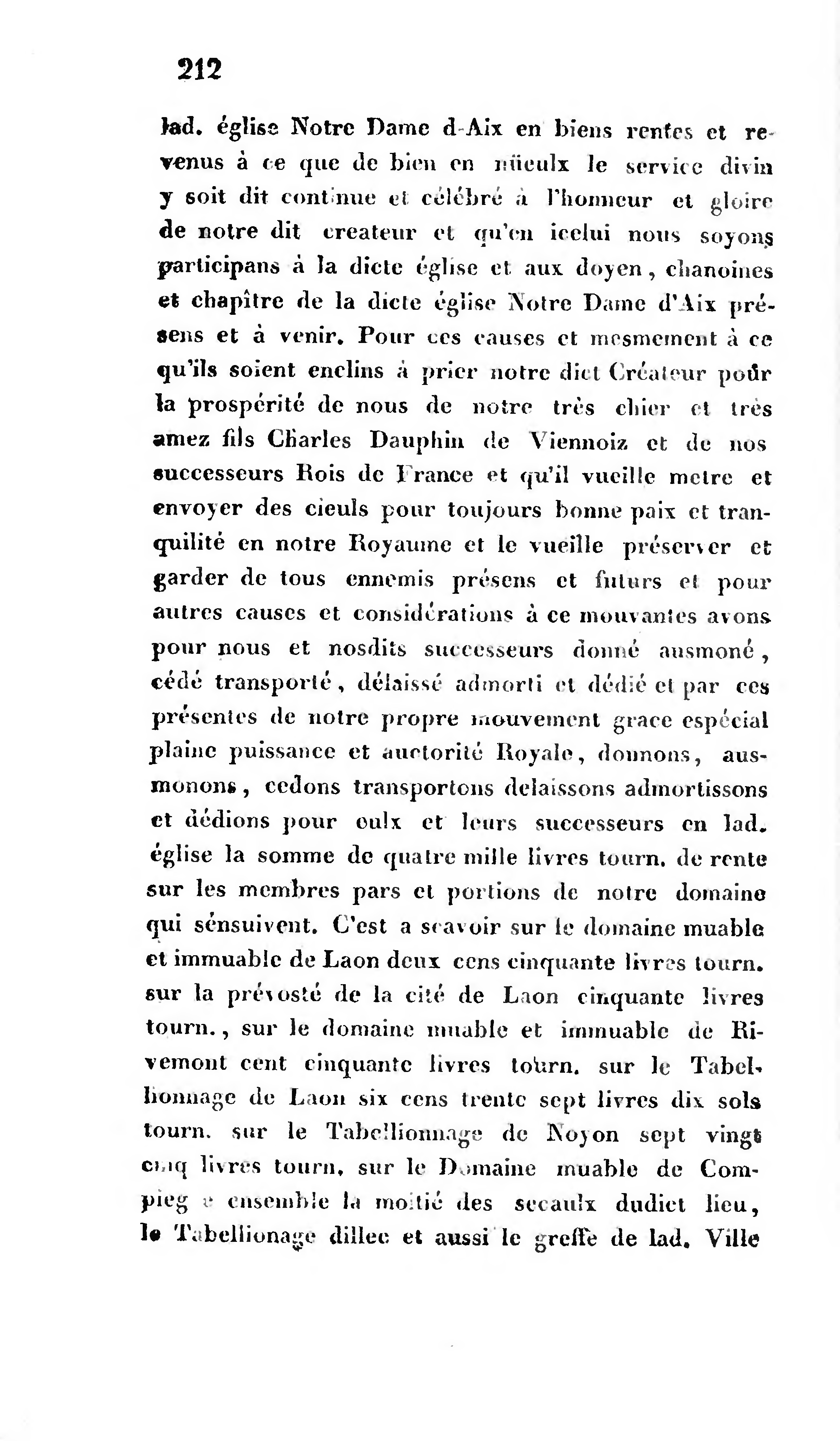 lad. église Notre Dame d-Aix en biens rentes et revenus à ce que de bien en nüeulx le service divin y soit dit continue et célébré à l'honneur et gloire de notre dit createur et qu'en icelui nous soyons participans à la dicte église et aux doyen, chanoines et cbapître de la dicte église Notre Dame d'Aix présens et à venir. Pour ces causes et mesmement à ce qu'ils soient enclins à prier notre dict Créateur pour la prospérité de nous de notre très chier et très amez fils Charles Dauphin de Viennoiz et de nos successeurs Rois de France et qu'il vueille metre et envoyer des cieuls pour toujours bonne paix et tranquilité en notre Royaume et le vueille préserver et garder de tous ennemis présens et futurs et pour autres causes et considérations à ce mouvantes avons pour nous et nosdits successeurs donné ausmoné, cédé transporté, délaissé admorti et dédié et par ces présentes de notre propre mouvement grace espécial plaine puissance et auctorité Royale, donnons, ausmonons, cedons transportons delaissons admortissons et dédions pour oulx et leurs successeurs en lad. église la somme de quatre mille livres tourn. de rente sur les membres pars el portions de notre domaine qui sénsuivent. C'est a scavoir sur le domaine muable et immuable de Laon deux cens cinquante livres tourn. sur la prévosté de la cité de Laon cinquante livres tourn., sur le domaine muable et immuable de Rivemont cent cinquante livres tourn. sur le Tabellionnage de Laon six cens trente sept livres dix sols tourn. sur le Tabellionnage de Noyon sept vingts cinq livres tourn. sur le Domaine muable de Compieg à enseble la moitié des secaulx dudict lieu, le Tabellionage dillec et aussi le greffe de lad, Ville