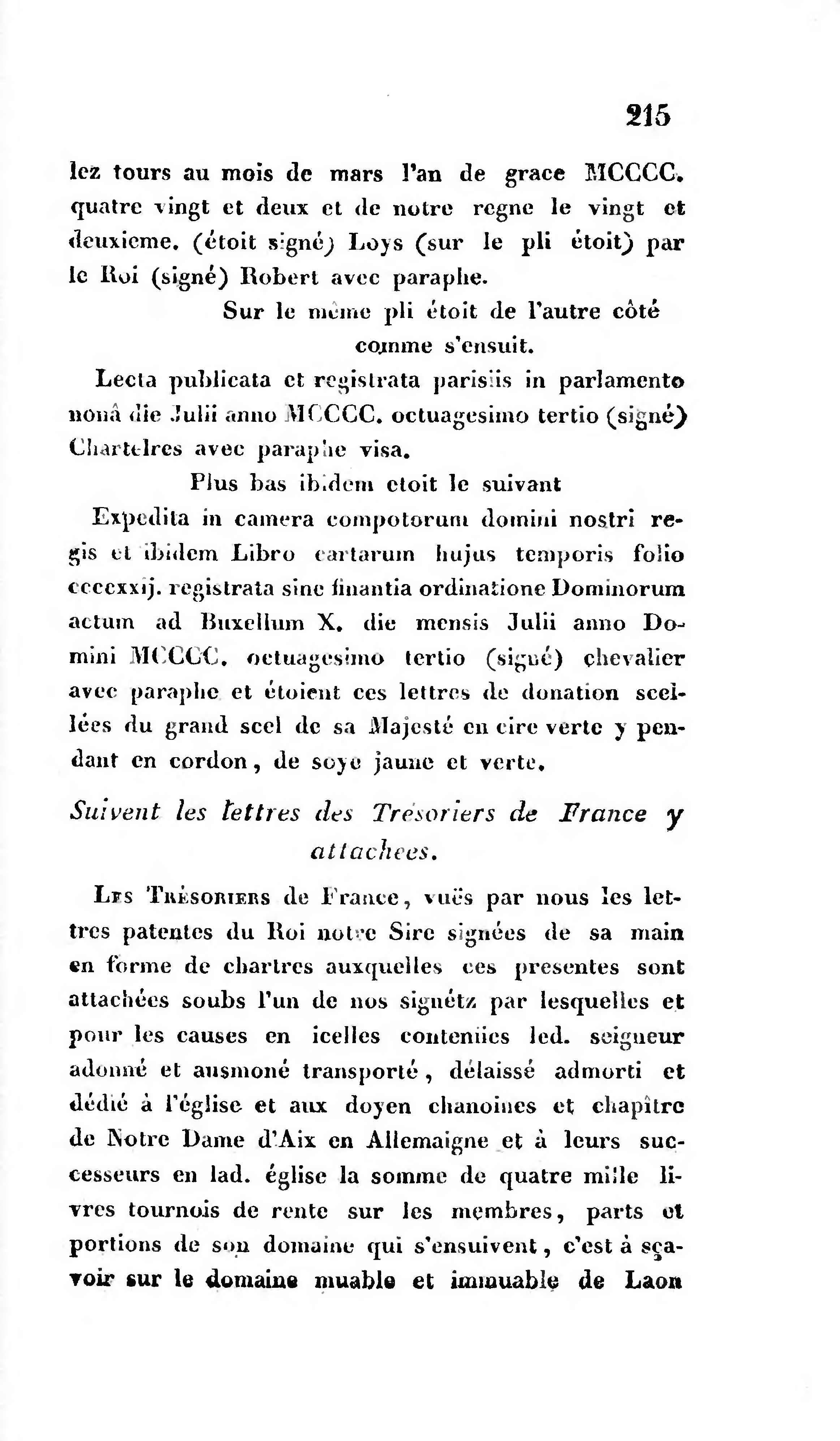 LES TRÈSORIERS de France, vuës par nous les lettres patentes du Roi notre Sire signées de sa main en forme de chartres auxquelles ces presentes sont attachées soubs l'un de nos signétz par lesquelles et pour les causes en icelles conteniies led. seigneur adonné et ausmoné transporté, délaissé admorti et dédié à l'église et aux doyen chanoines et chapitre de Notre Dame d'Aix en Allemaigne et à leurs successeurs en lad. église la somme de quatre mille livres tournois de rentc sur les membres, parts ot portions de son domaine qui s'ensuivent, c'est à sçavoir sur le domaine muable et immuable de Laon
