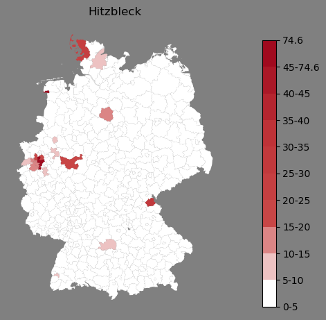 Relative Verteilung des Namens Hitzbleck (1996)Direkt zur Karte Die Farbskala zeigt die Anzahl von "Hitzbleck" bezogen auf je 1 Million Einträge. |