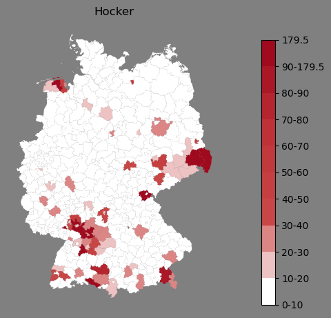 Relative Verteilung des Namens Hocker (1996)Direkt zur Karte Die Farbskala zeigt die Anzahl von "Hocker" bezogen auf je 1 Million Einträge. |
