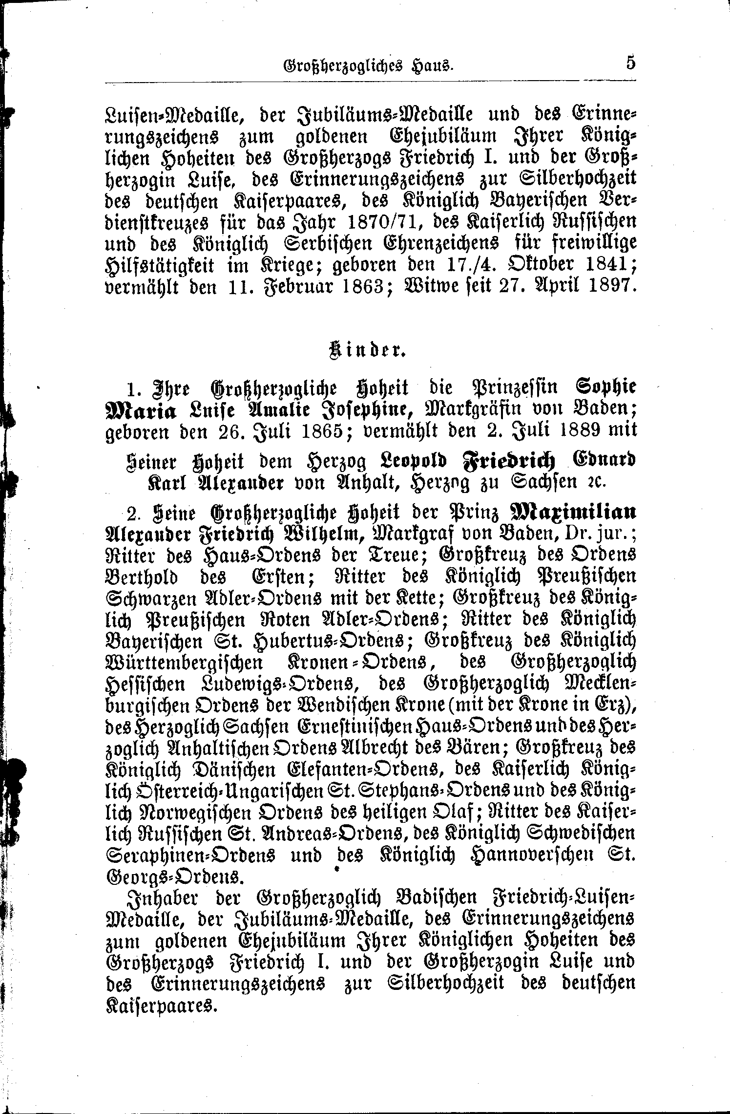 1.Ihre Großherzogliche Hoheit die Prinzessin Sophie Maria Luise Amalie Josephine, Markgräfin von Baden; geboren den 26. Juli 1865; vermählt den 2. Juli 1889 mit