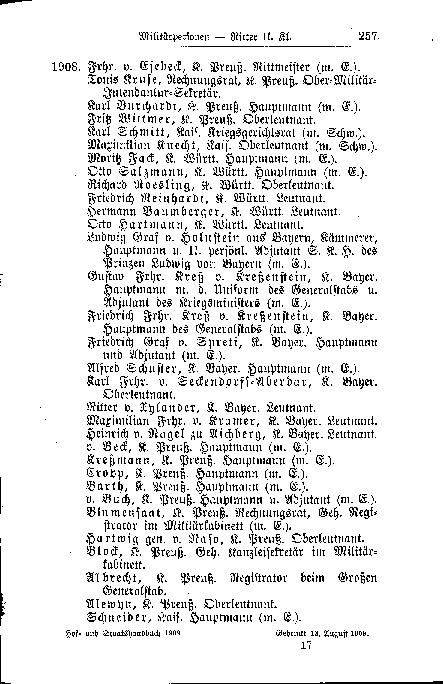 - Gustav Frhr. Kreß v. Kreßenstein, K. Bayer. Hauptmann m. d. Uniform des Generalstabs u. Adjudant des Kriegsministers (mit Eichenlaub).