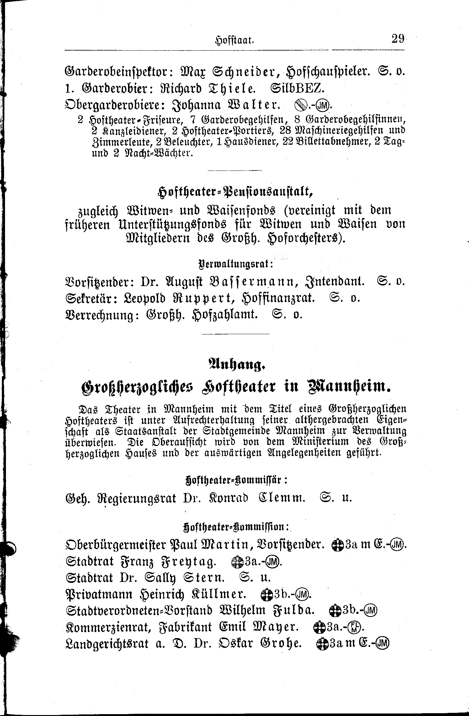 - 2 Hoftheater-Friseure, 7 Garderobegehilfen, 8 Garderobegehilfinnen, 2 Kanzleidiener, 2 Hoftheater-Portiers, 28 Maschinereigehilfen und Zimmerleute, 2 Beleuchter, 1 Hausdiener, 22 Bellettabnehmer, 2 Tag- und 2 Nacht-Wächter.