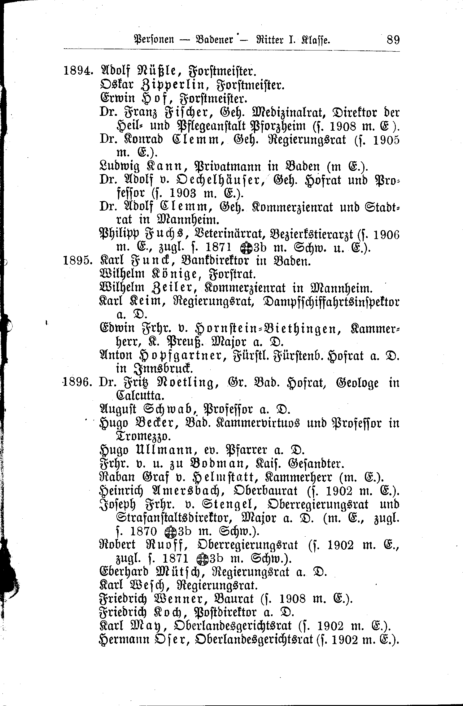 - Philipp Fuchs, Veterinärrat, Bezirkstierarzt (s. 1906 mit Eichenlaub, zugl. s. 1871 Zähringer Löwenorden Ritter II. Kl. mit Schwertern und Eichenlaub).