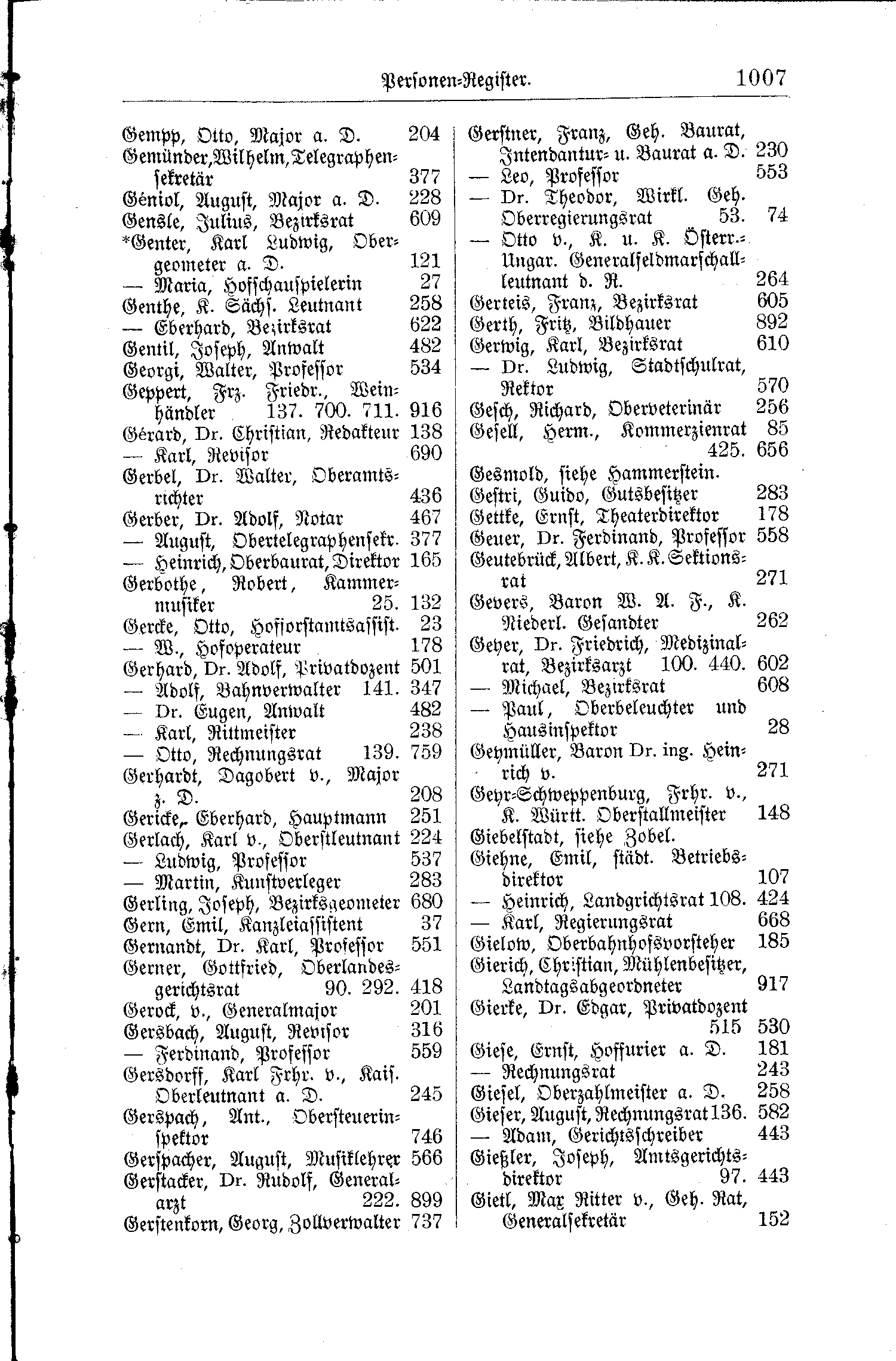 | Gerock, v., Generalmajor | 201 | Gietl, Max Ritter v., Geh. Rat, Generalsekretär | 152 |