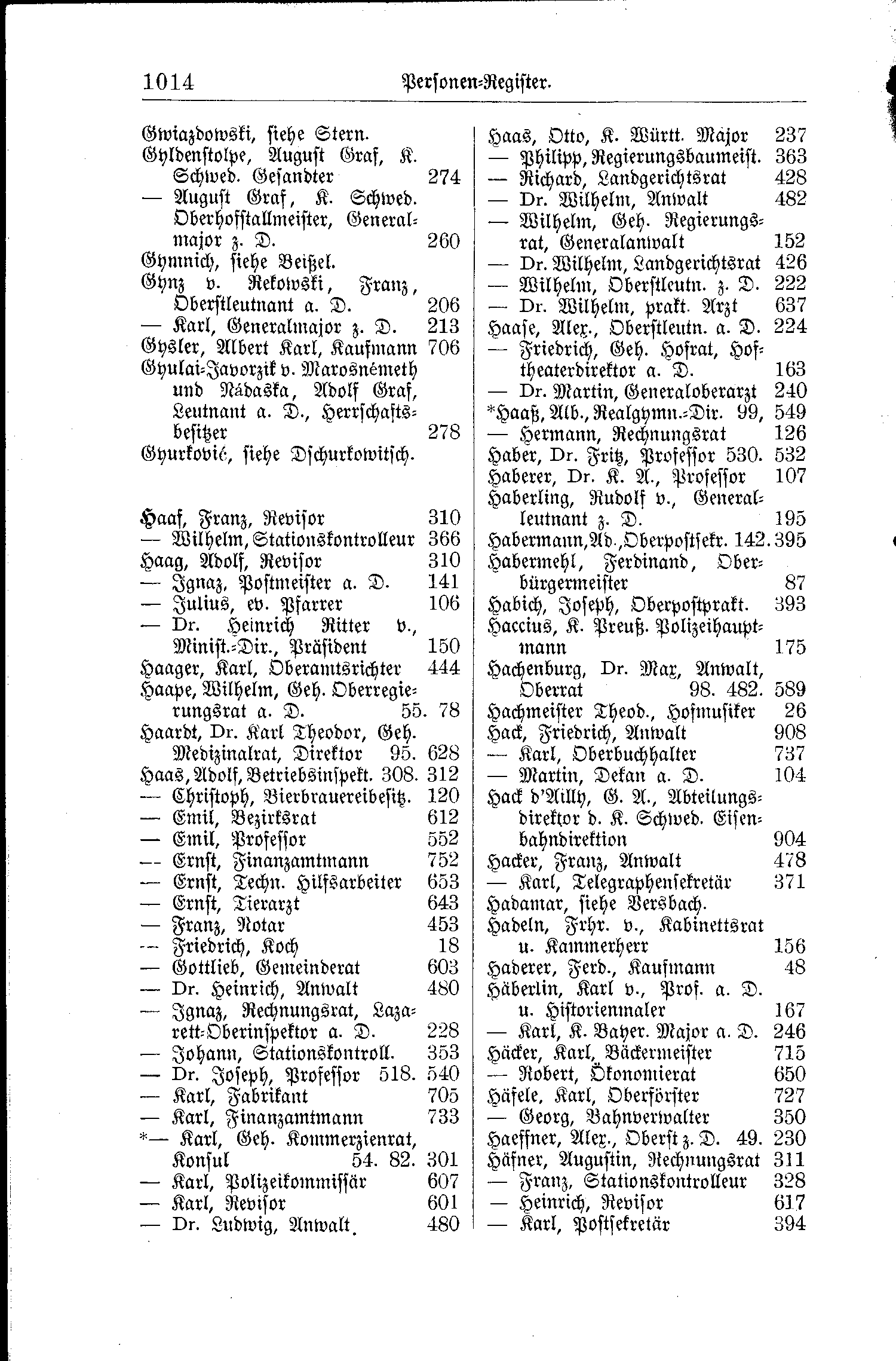 | Gyulai-Javorzik v. Marosnémeth und Nádaska, Adolf Graf, Leutnant a. D., Herrschaftsbesitzer | 278 | -- Dr.Wilhelm, prakt. Arzt | 637 |