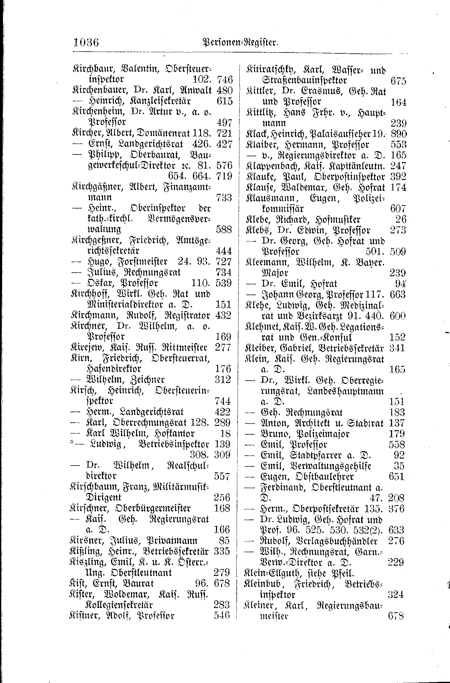 | Kirchgäßner, Albert, Finanzamtmann | 733 | Klauke, Paul, Oberpostinspektor | Klause, Waldemar, Geh. Hofrat | 174 |