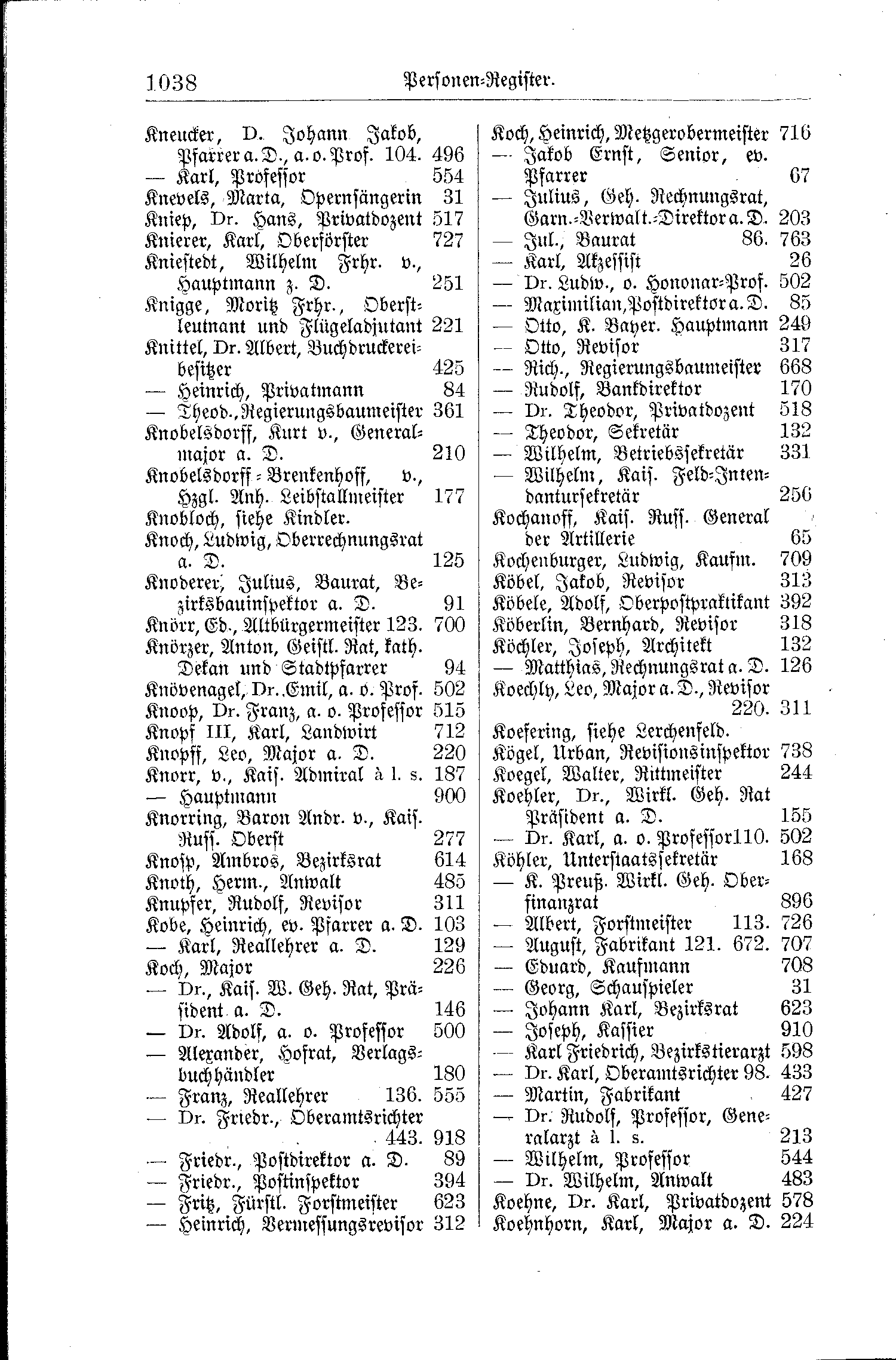 | Knevels, Marta, Opernsängerin | 31 | -- Julius, Geh. Rechnungsrat, Garn.-Verwalt.-Direktor a. D. | 203 |