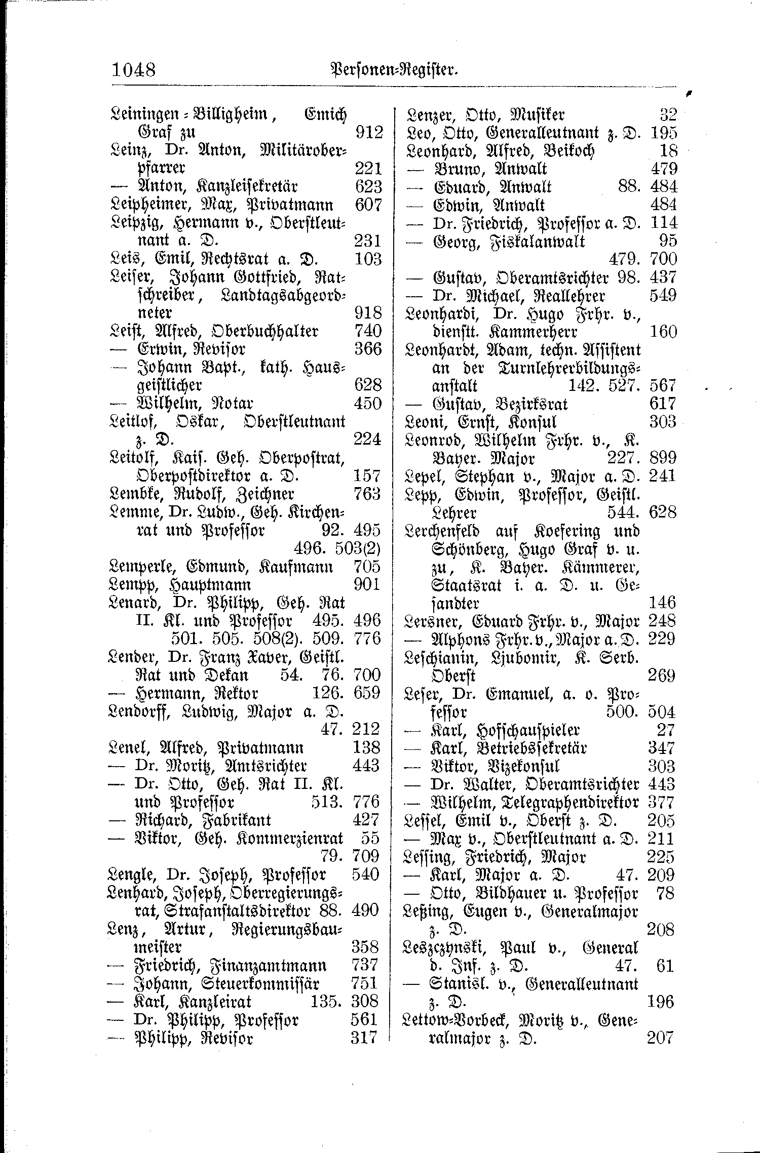 | Lemperle, Edmund, Kaufmann | 705 | Leonrod, Wilhelm Frhr. v., K. Bayer. Major | 227. 899 |