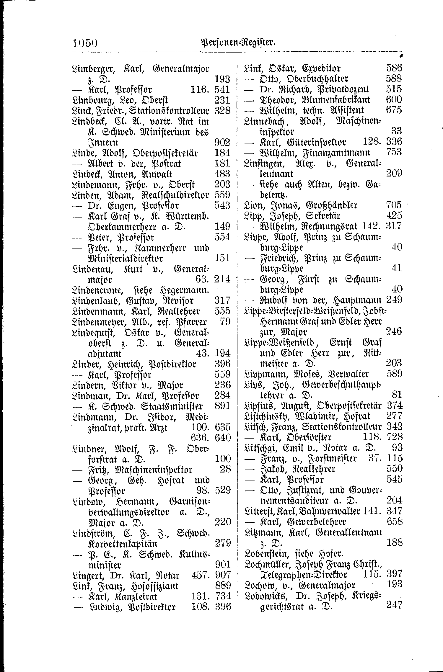 | Limberger, Karl, Generalmajor z. D. | 193 | Link, Oskar, Expeditor | 586 |