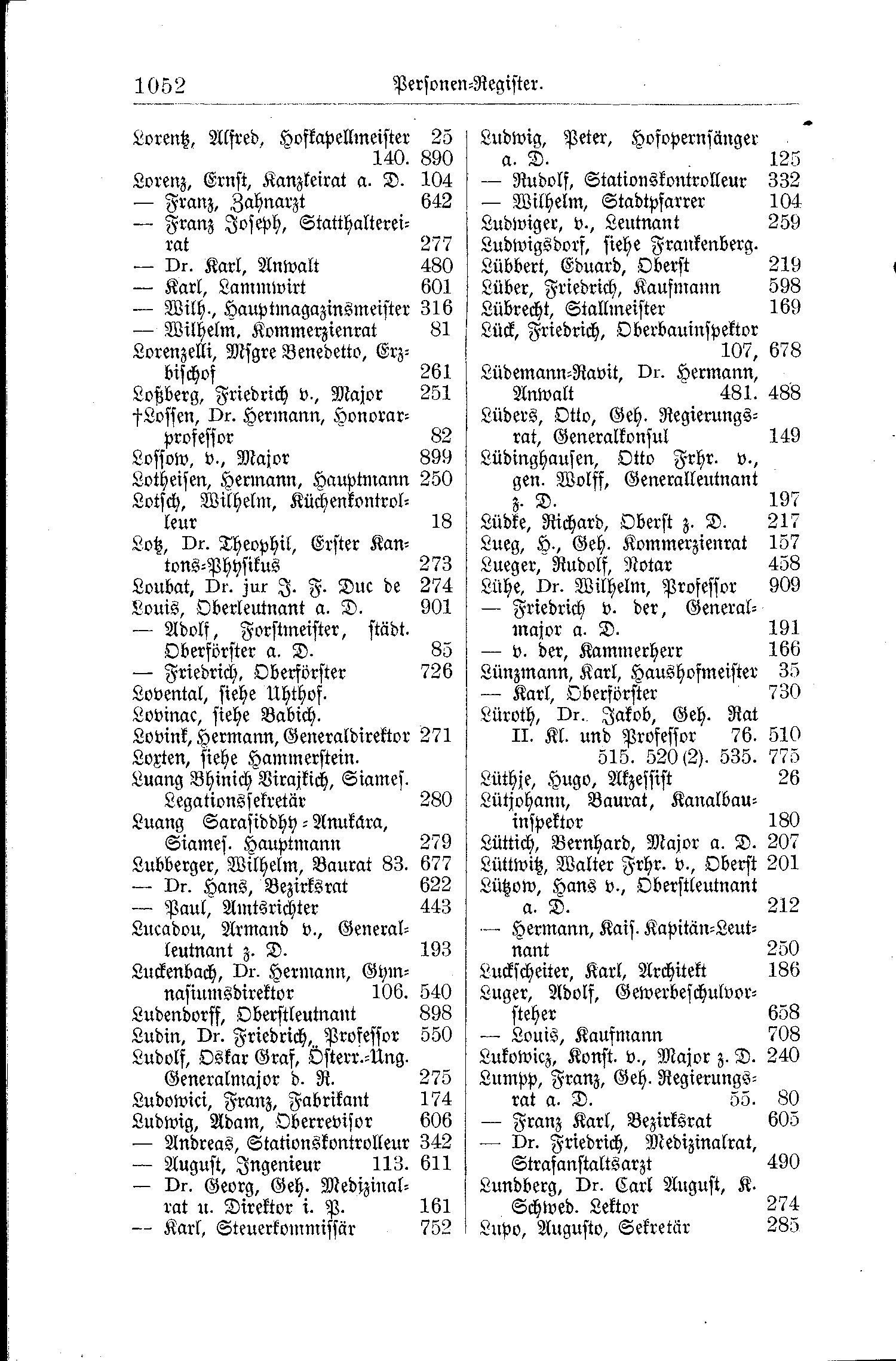 | Lotsch, Wilhelm, Küchenkontrolleur | 18 | Lueg, H., Geh. Kommerzienrat | 157 |