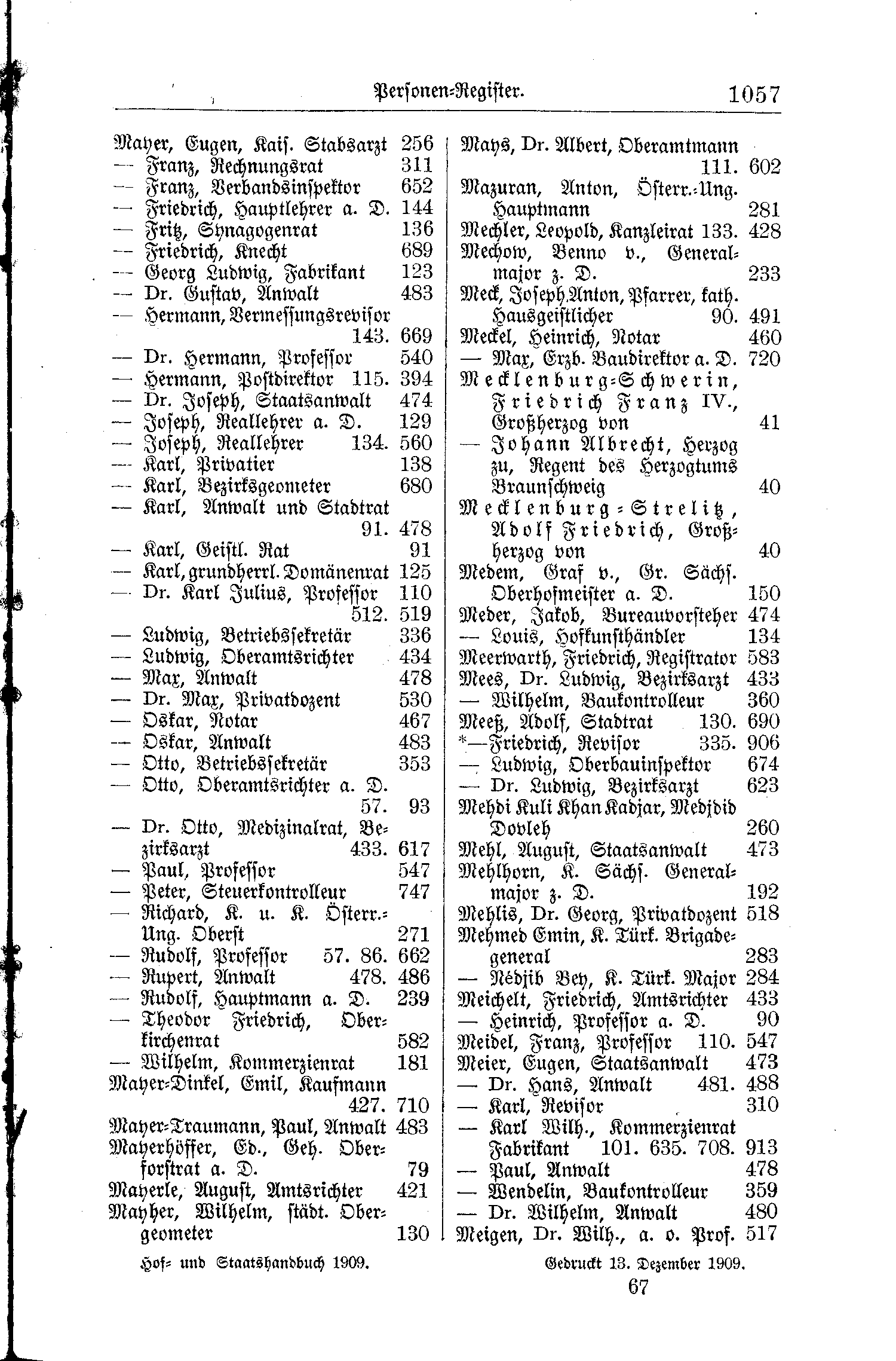 | Mayer, Eugen, Kais. Stabsarzt | 256 | Mays, Dr. Albert, Oberamtmann | 111. 602 |