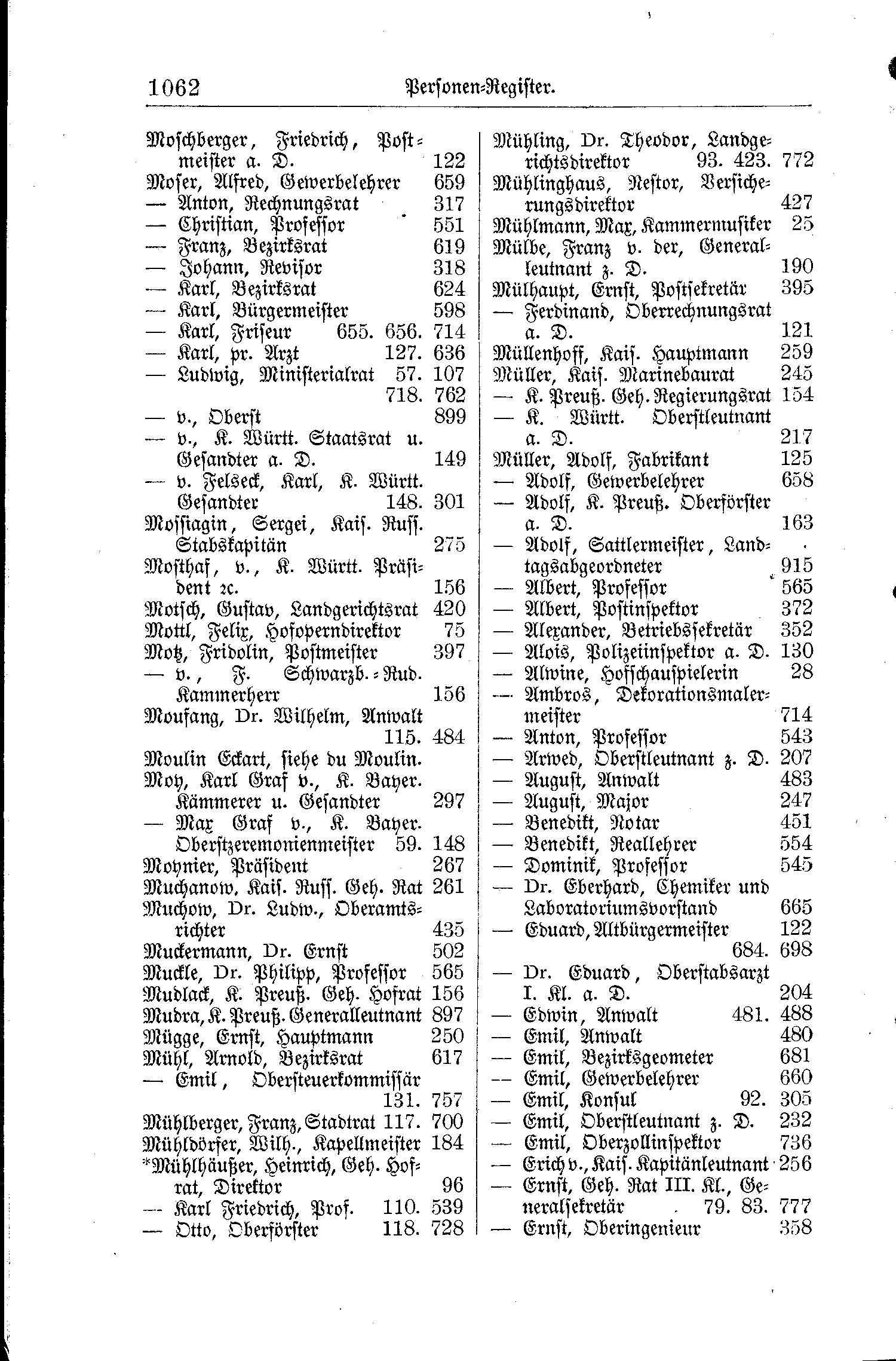 | Moschberger, Friedrich, Postmeister a. D. | 122 | Mühling, Dr. Theodor, Landgerichtsdirektor | 93. 423. 772 |