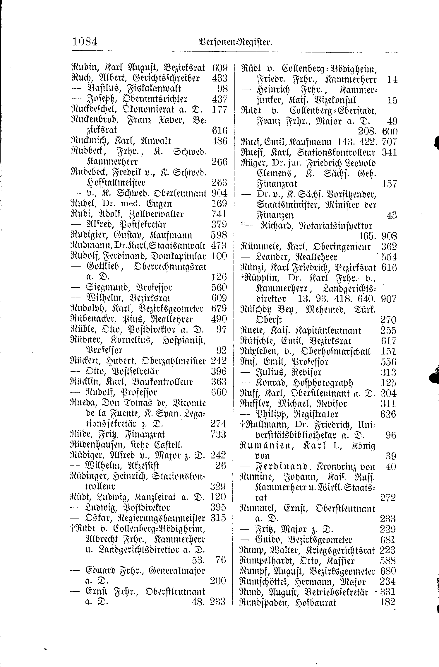 | Rudi, Adolf, Zollverwalter | 741 | *Rüpplin, Dr. Karl Frhr. v., Kammerherr, Landgerichtsdirektor | 13. 93. 418. 640. 907 |