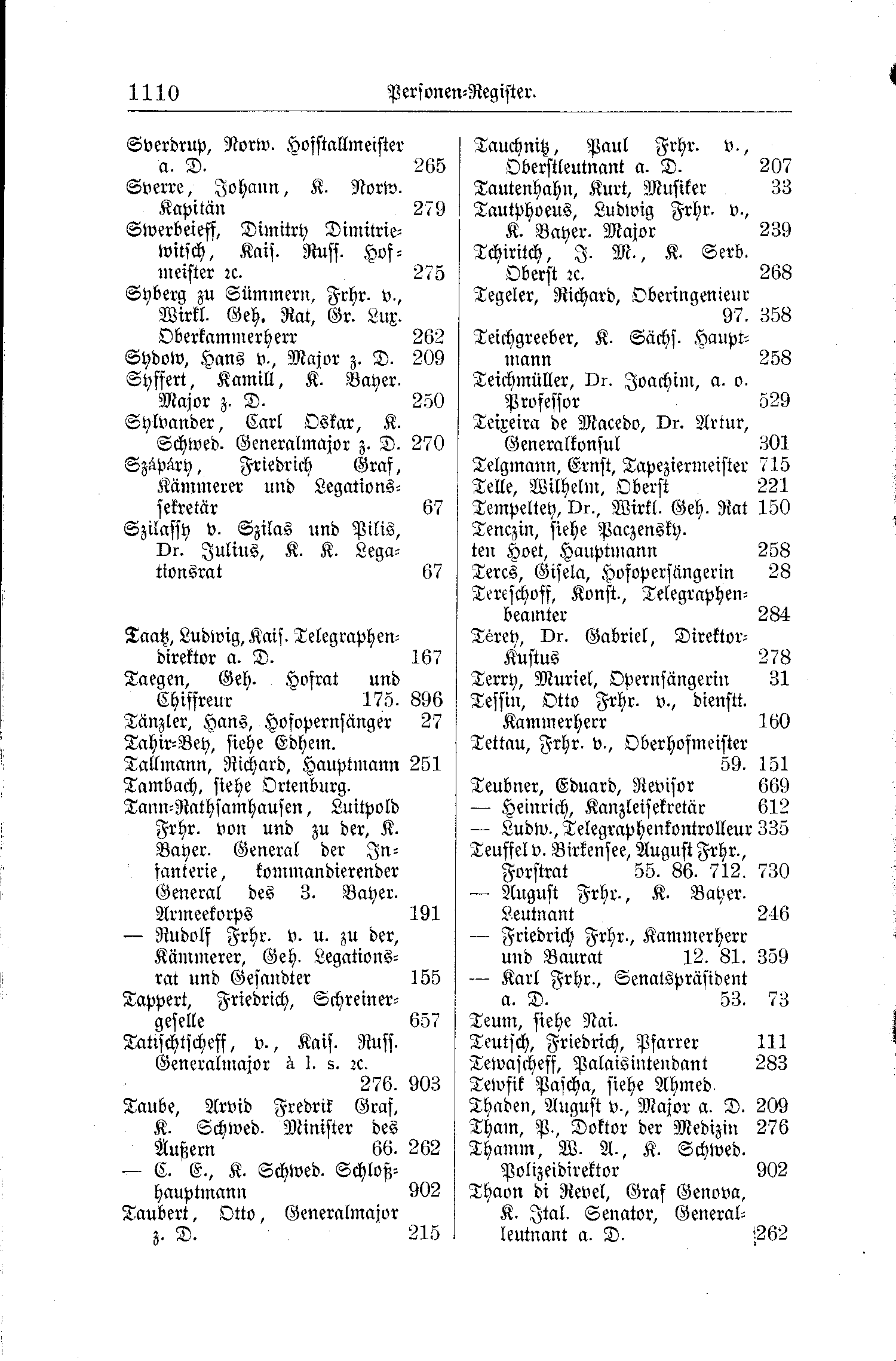 | Tann-Rathsamhausen, Luitpold Frhr. von und zu der, K- Bayer. General der Infanterie, kommandierender General des 3. Bayer. Armeekorps | 191 | Tessin, Otto Frhr. v., dienstt. Kammerherr | 160 |
