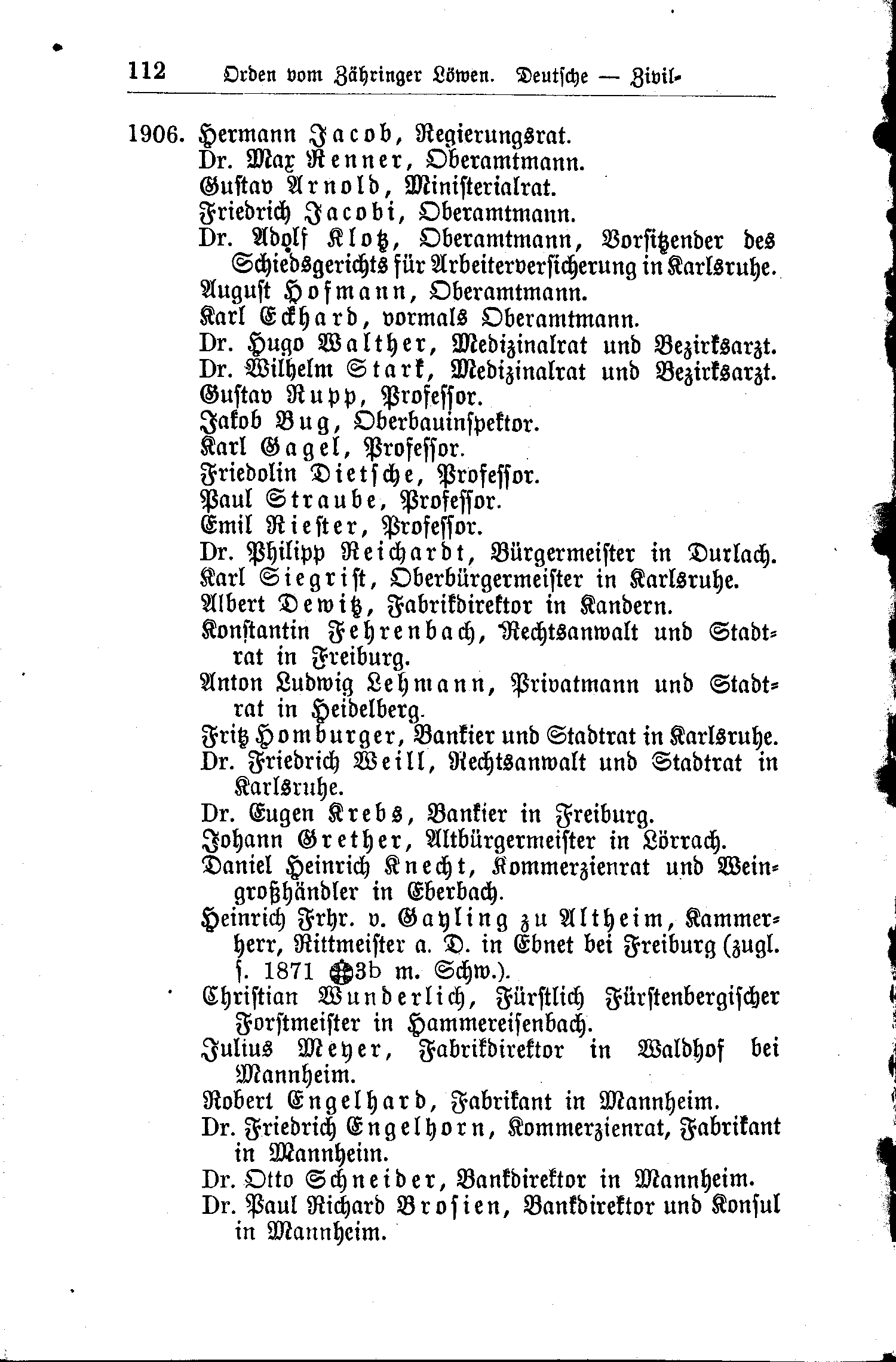 - Heinrich Frhr. v. Gayling zu Altheim, Kammerherr, Rittmeister a. D. in Ebnet bei Freiburg (zugl. seit 1871 Zähringer Löwenorden Ritter II. Kl. mit Schwertern).