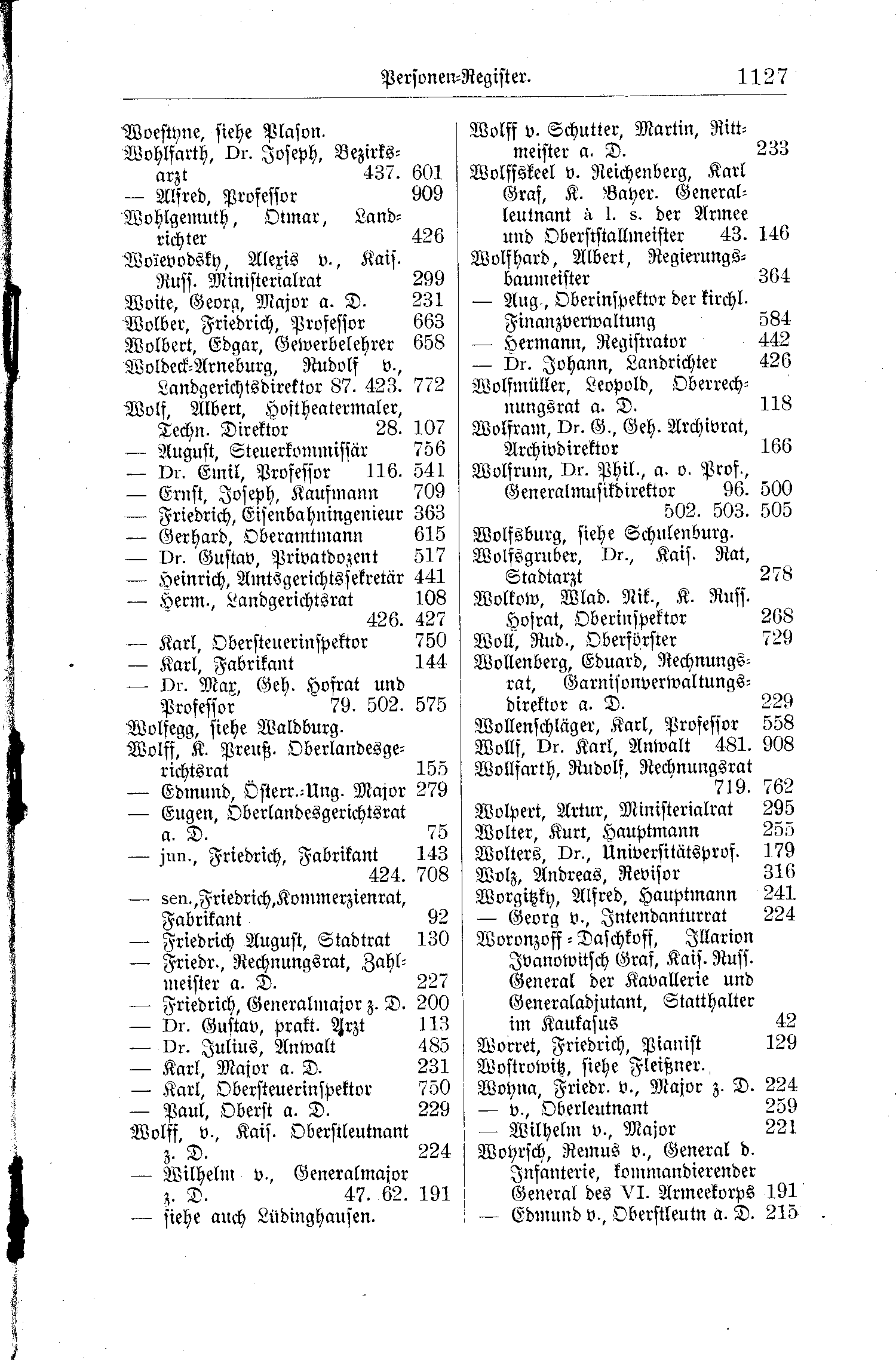 | Wohlfarth, Dr. Joseph, Bezirksarzt | 437. 601 | Wolfskeel v. Reichenberg, Karl Graf, K. Bayer. Generalleutnant à. l. s. der Armee und Oberststallmeister | 43. 146 |