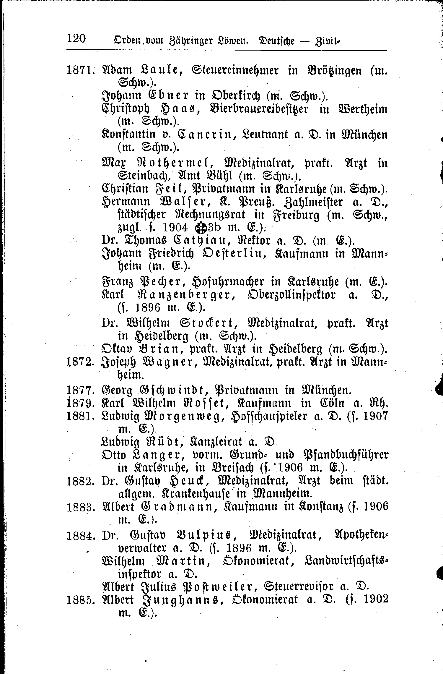 - Hermann Walser, K. Preuß. Zahlmeister a. D., städtischer Rechnungsrat in Freiburg (mit Schwertern, zugl. seit 1904 Zähringer Löwenorden Ritter II. Kl mit Eichenblatt).