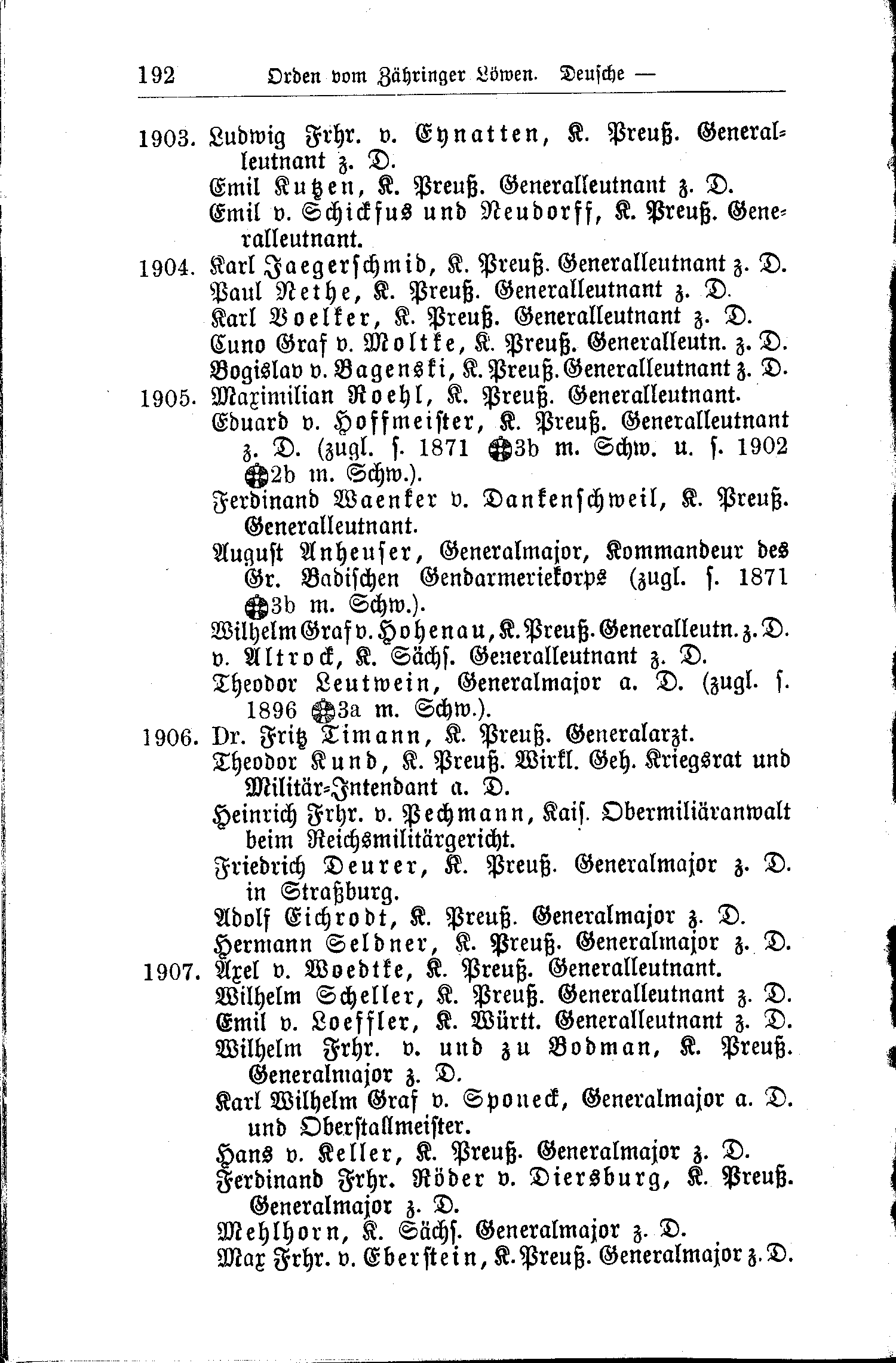 - Eduard v. Hoffmeister, K. Preuß. Generalleutnant z. D.( zugleich seit 1871 Zähringer Löwenorden Ritter II. Kl. mit Schwertern und seit 1902 Zähringer Löwenorden Kommandeur II. Kl. mit Schwertern).