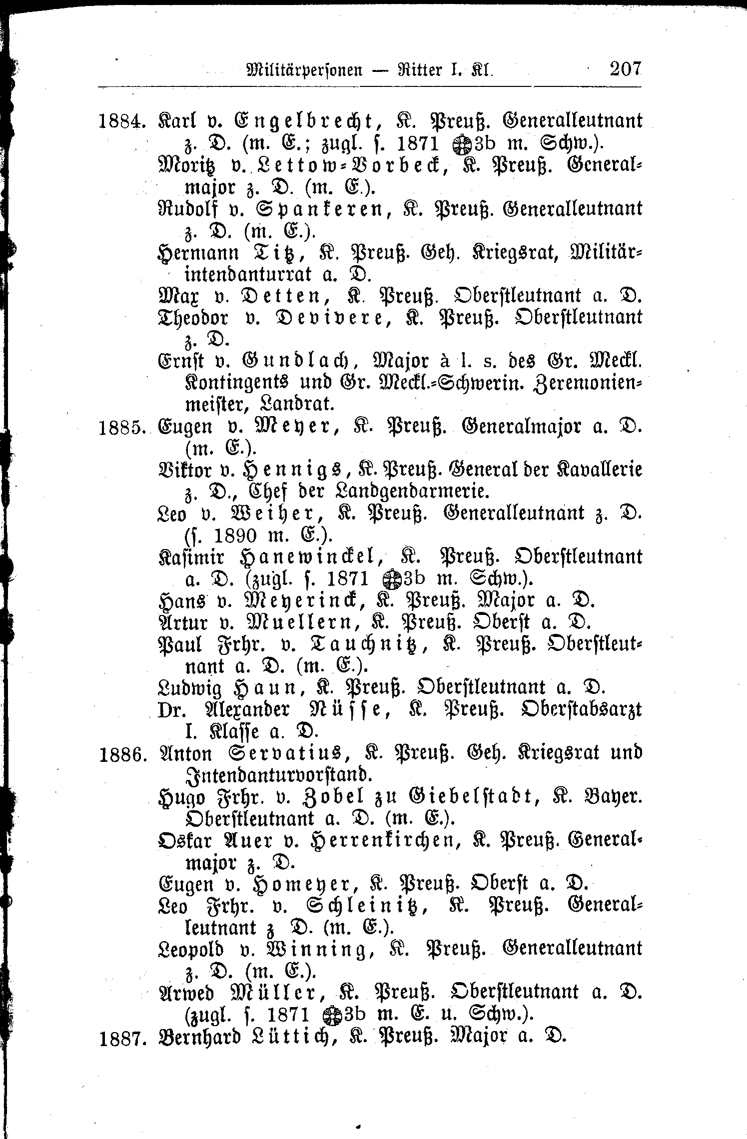 - Karl v. Engelbrecht, K. Preuß. Generalleutnant z. D. (mit Eichenlaub; zugleich seit 1871 Zähringer Löwenorden Ritter II. Kl. mit Schwertern).