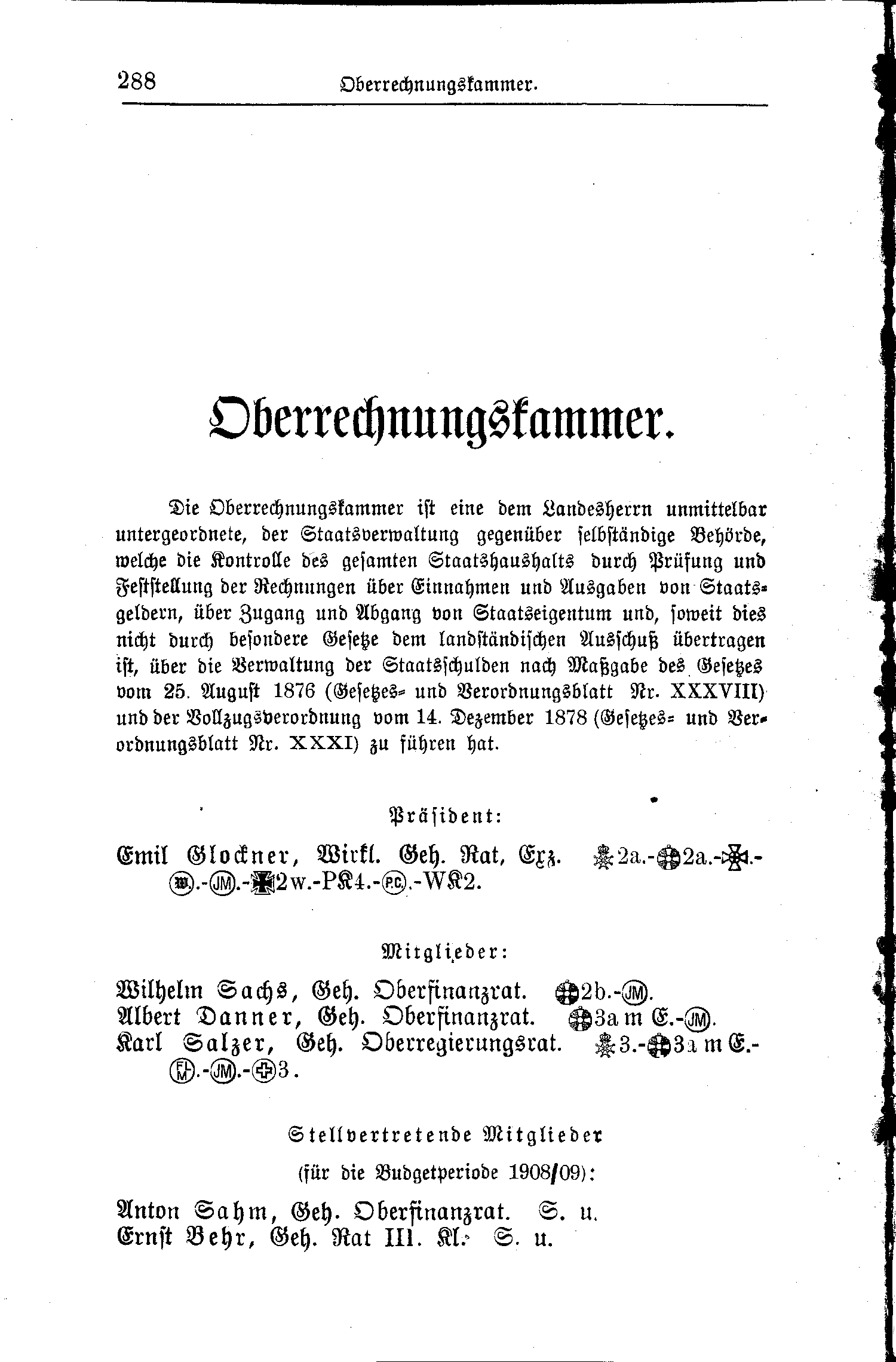 Die Oberrechnungskammer ist eine dem Landesherrn unmittelbar untergeordnete, der Staatsverwaltung gegenüber selbständige Behörde, welche die Kontrolle des gesamten Staatshaushalts durch Prüfung und Feststellung der Rechnungen über Einnahmen und Ausgaben von Staatsgeldern, über Zugang und Abgang von Staatseigentum und, soweit dies nicht durch besondere Gesetze dem landständischen Ausschuß übertragen ist, über die Verwaltung der Staatsschulden nach Maßgabe des Gesetzes vom 25. August 1876 (Gesetzes- und Verordnungsblatt Nr. XXXVIII) und der Vollzugsverordnung vom 14. Dezember 1878(Gesetzes- und Verordnungsblatt Nr. XXXI) zu führen hat.