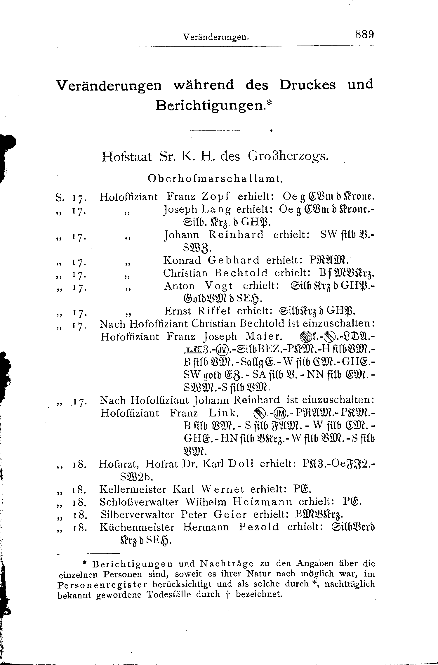 - S.17. Nach Hofoffiziant Johann Reinhard ist einzuschalten: Hofoffiziant Franz Link. silberne Verdienstmedaille - Jubiläumsmedaille - K. Preußische Rote Adlermedaille - K. Preußische Kronenordenmedaille - K. Bayerische Verdienstmedaille - K. Sächsische Friedrich August-Medaille - K. Württembergische silberne Zivilverdienstmedaille - Großh. Hessisches Allgemeines Ehrenzeichen - Herzogl. Nassauisches silbernes Verdienstkreuz - Fürstl. Waldecksche silberne Verdienstmedaille - K. Schwedische silberne Verdienstmedaille.
