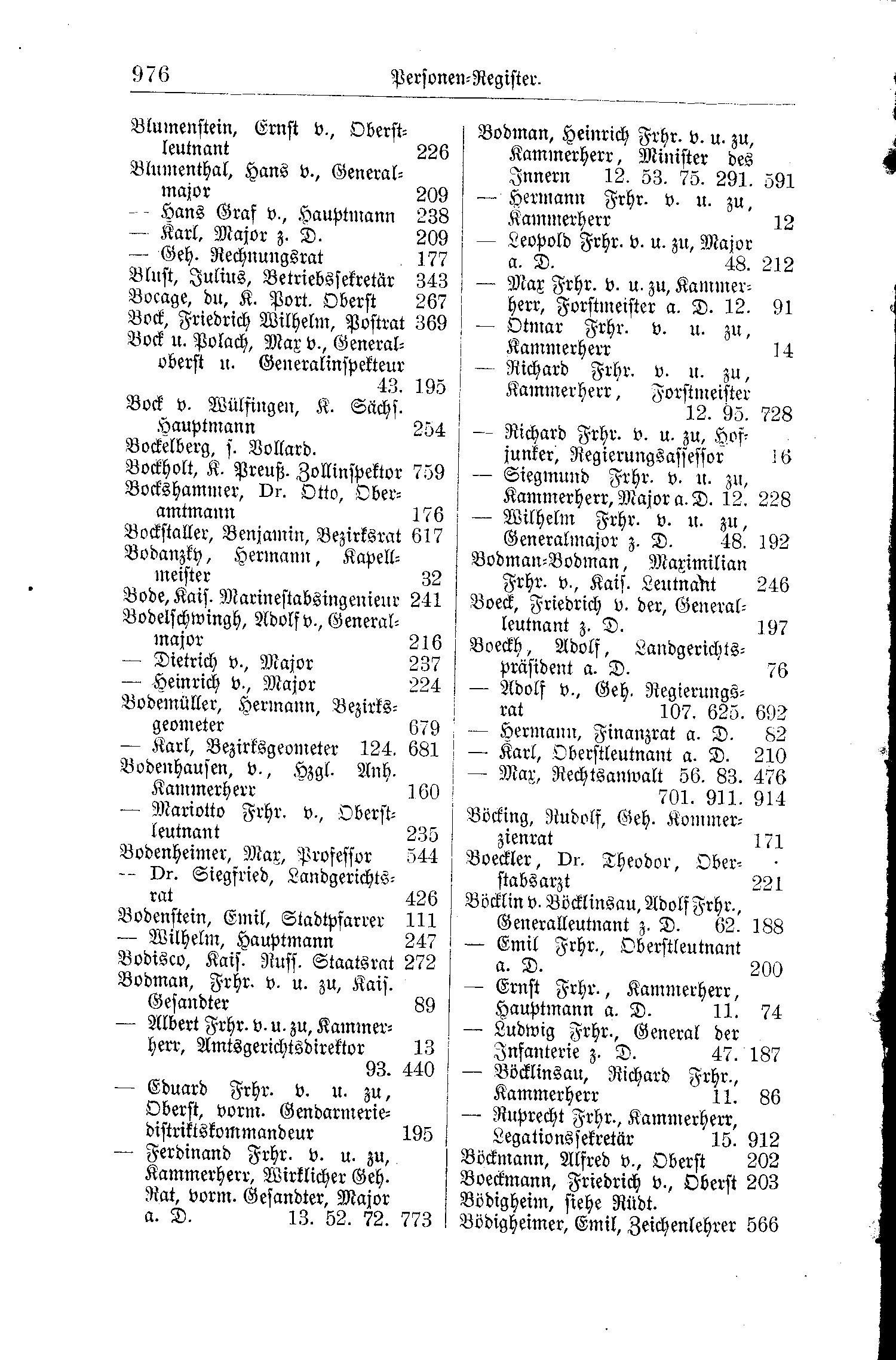 | Bock, Friedrich Wilhelm, Postrat | 369 | -- Siegmund Frhr. v. u. zu, Kammerherr, Major a. D. | 12. 228 |