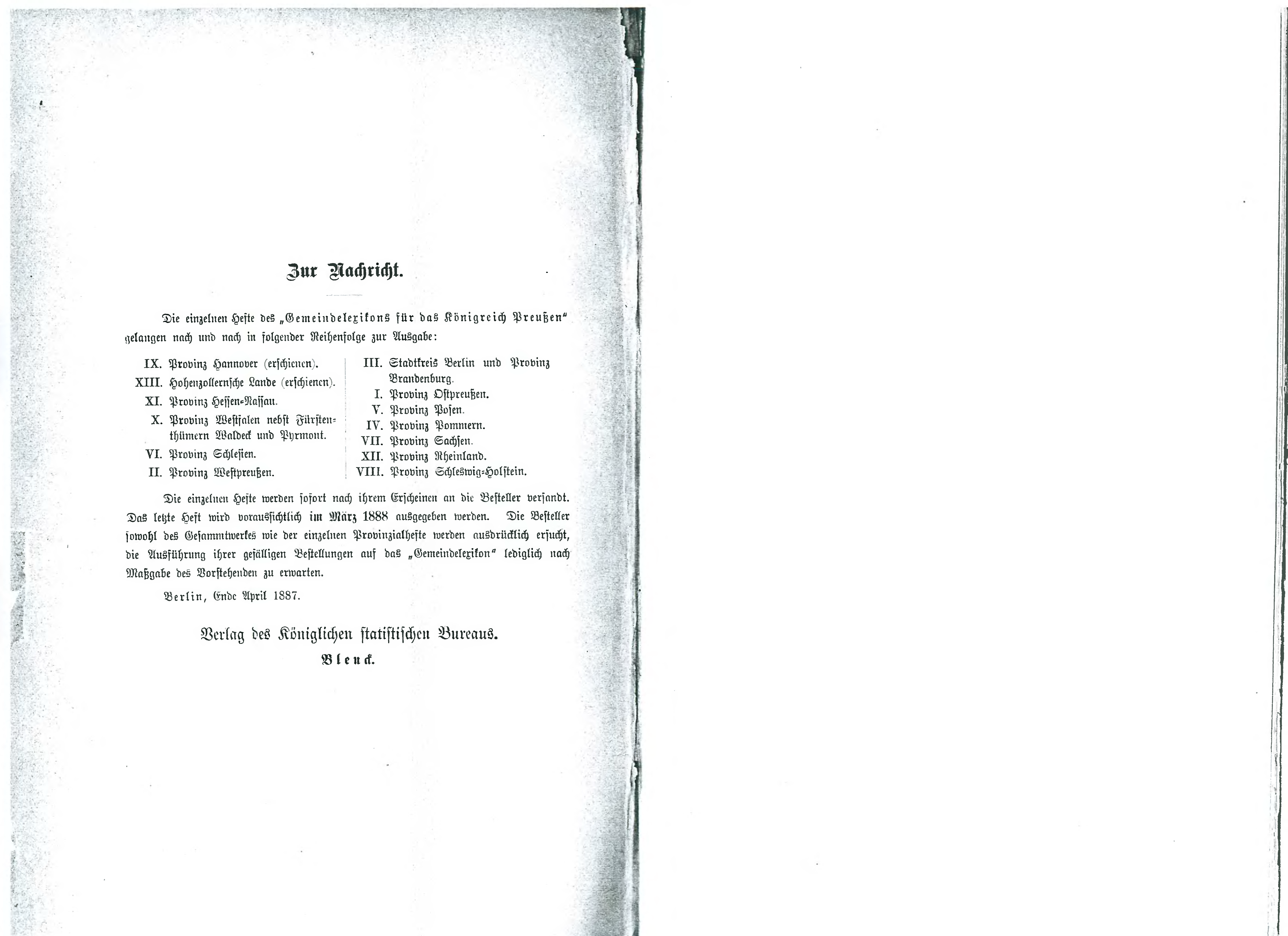 Die einzelnen Hefte werden sofort nach ihrem Erscheinen an die Besteller versandt. Das letzte Heft wird voraussichtlich im März 1888 ausgegeben werden. Die Besteller sowohl des Gesammtwerkes wie der einzelnen Provinzialhefte werden ausdrücklich ersucht, die Ausführung ihrer gefälligen Bestellungen auf das "Gemeindelexikon" lediglich nach Maßgabe des Vorstehenden zu erwarten.
