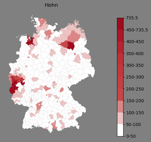 Relative Verteilung des Namens Hohn (1996)Direkt zur Karte Die Farbskala zeigt die Anzahl von "Hohn" bezogen auf je 1 Million Einträge. |