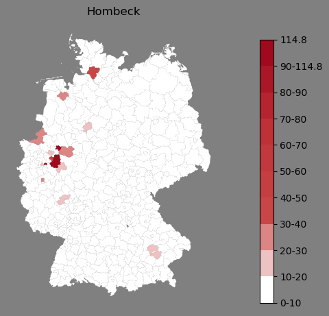 Relative Verteilung des Namens Hombeck (1996)Direkt zur Karte Die Farbskala zeigt die Anzahl von "Hombeck" bezogen auf je 1 Million Einträge. |
