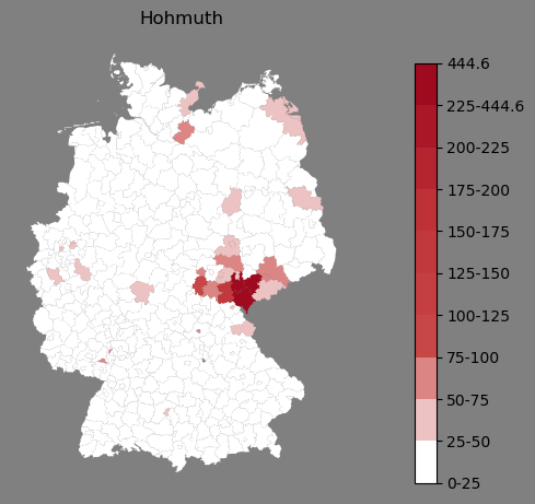 Absolute Verteilung des Namens Hohmuth (1890)Direkt zur Karte Absolute Verteilung des Namens "Hohmuth" um 1890 im damaligen Deutschen Reich Sie können die Karte innerhalb des Fensters zoomen und verschieben. |