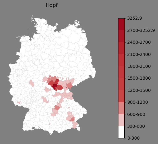 Relative Verteilung des Namens Hopf (1996)Direkt zur Karte Die Farbskala zeigt die Anzahl von "Hopf" bezogen auf je 1 Million Einträge. |